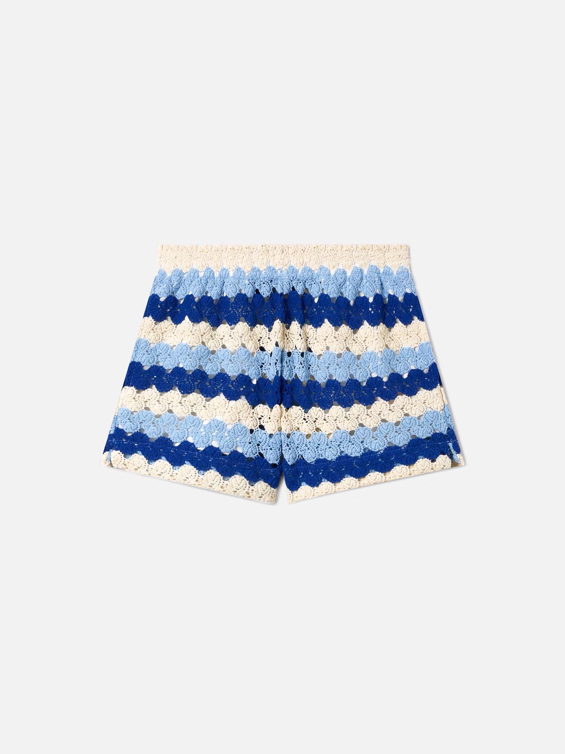 The Meave shorts are made from cotton blend fabric with crochet construction, lightweight and breathable. The design with blue crochet striped pattern defines the garment with a decorative and distinctive texture. The model features an elasticated waistband that ensures a comfortable fit and side pockets. The wide-leg line with mid waist guarantees a regular fit.