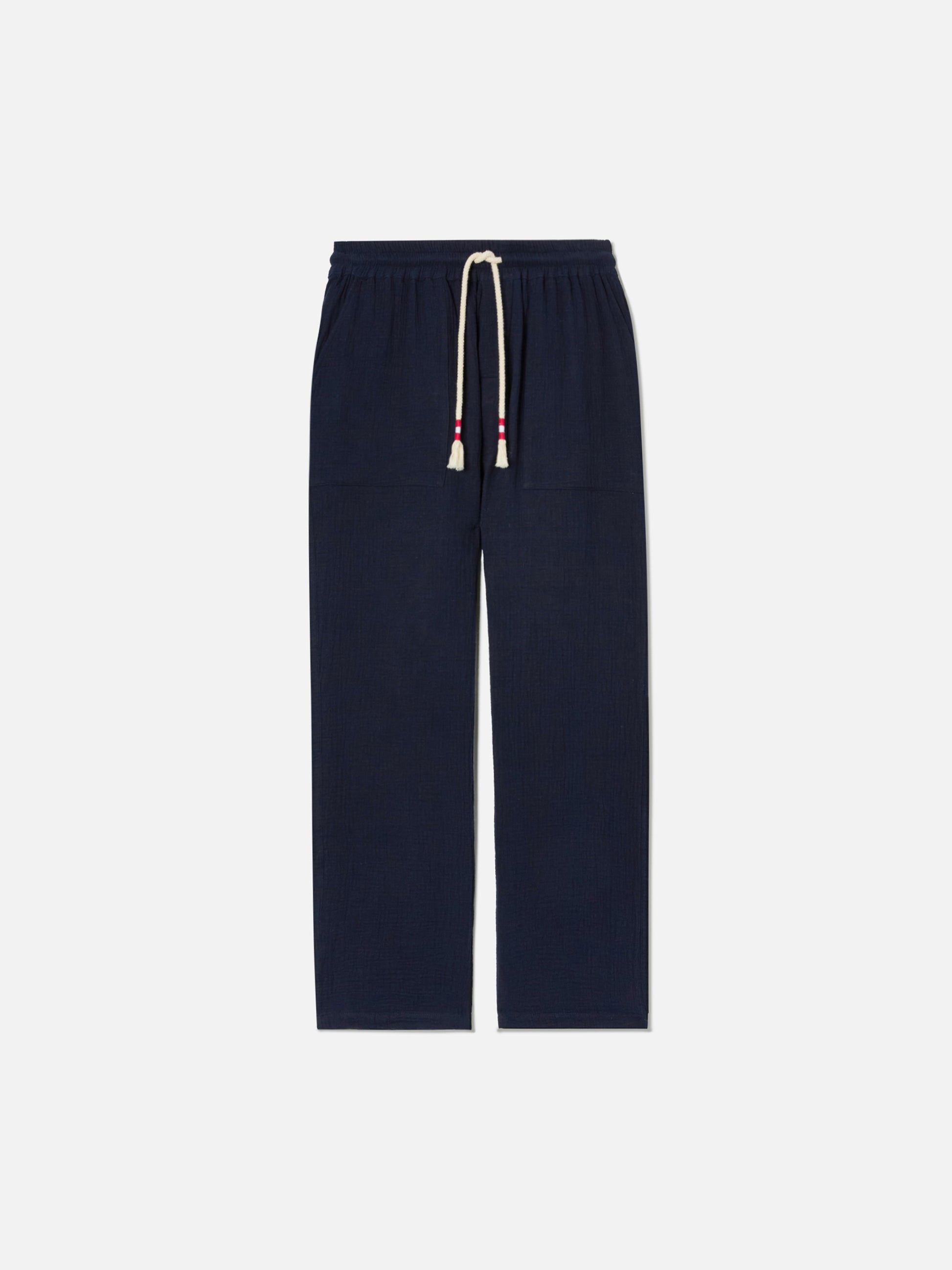 The Calais long pants are crafted from crinkled pure cotton gauze, a lightweight and breathable fabric designed to offer comfort and ease. The navy blue solid color design enhances the clean aesthetic of the style. The elasticated waistband with braided rope drawstring with contrast binding allows easy adjustment of the fit. The style is completed with front slanted pockets, back flap pockets with logo buttons and a logo label applied on the back of the waistband. The straight leg and relaxed fit ensure comfort and freedom of movement.