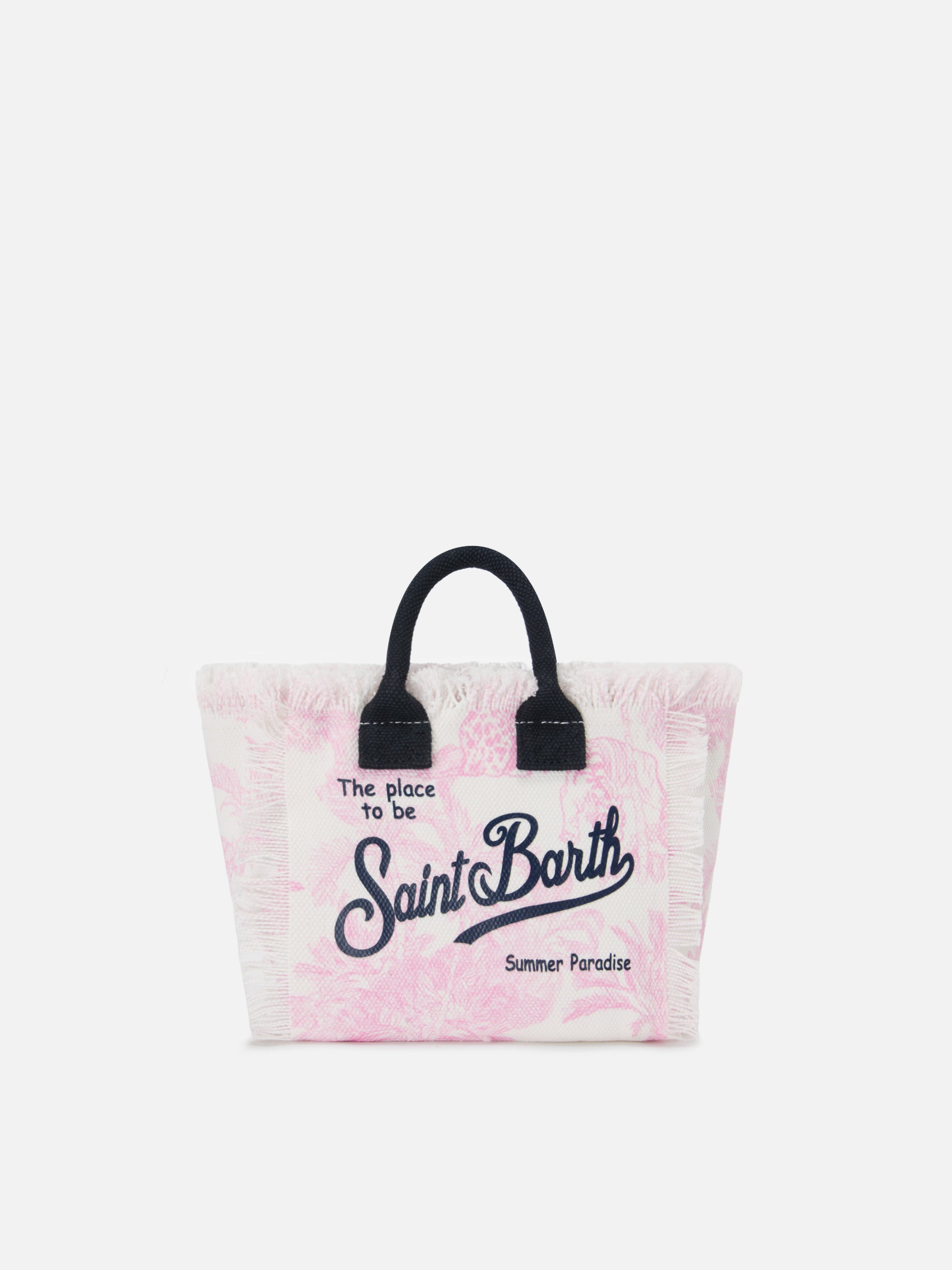 The Vanity mini bag is crafted in canvas with a soft-structured silhouette and refined all over pink toile de Jouy print. Side and top fringes add movement, while the printed logo on the front completes the design with a distinctive graphic detail. Compact and practical, it features a top zip closure, an internal pocket and a removable strap.