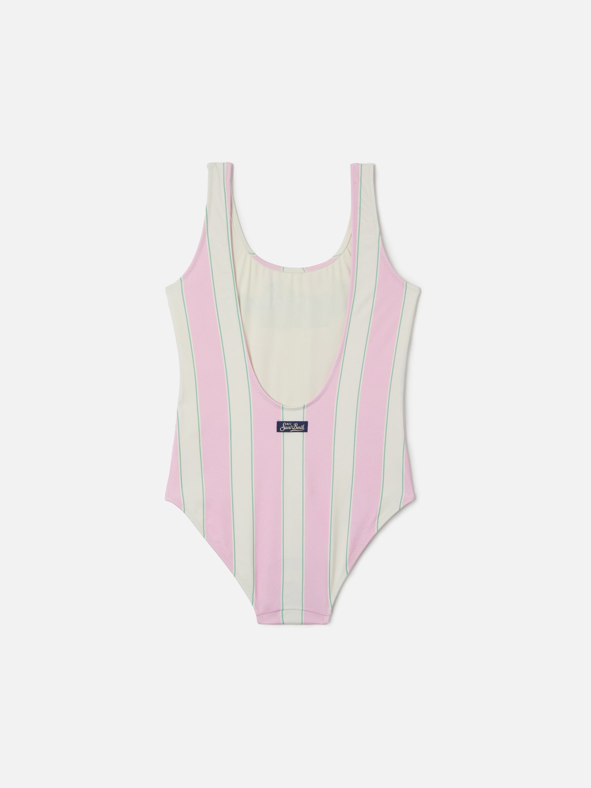 Cara pink and white striped one-piece swimsuit with Beach Club print