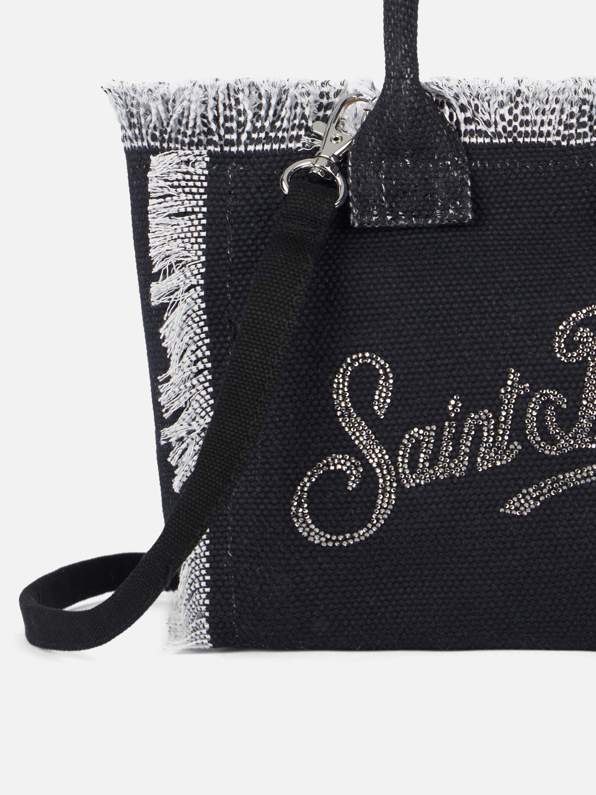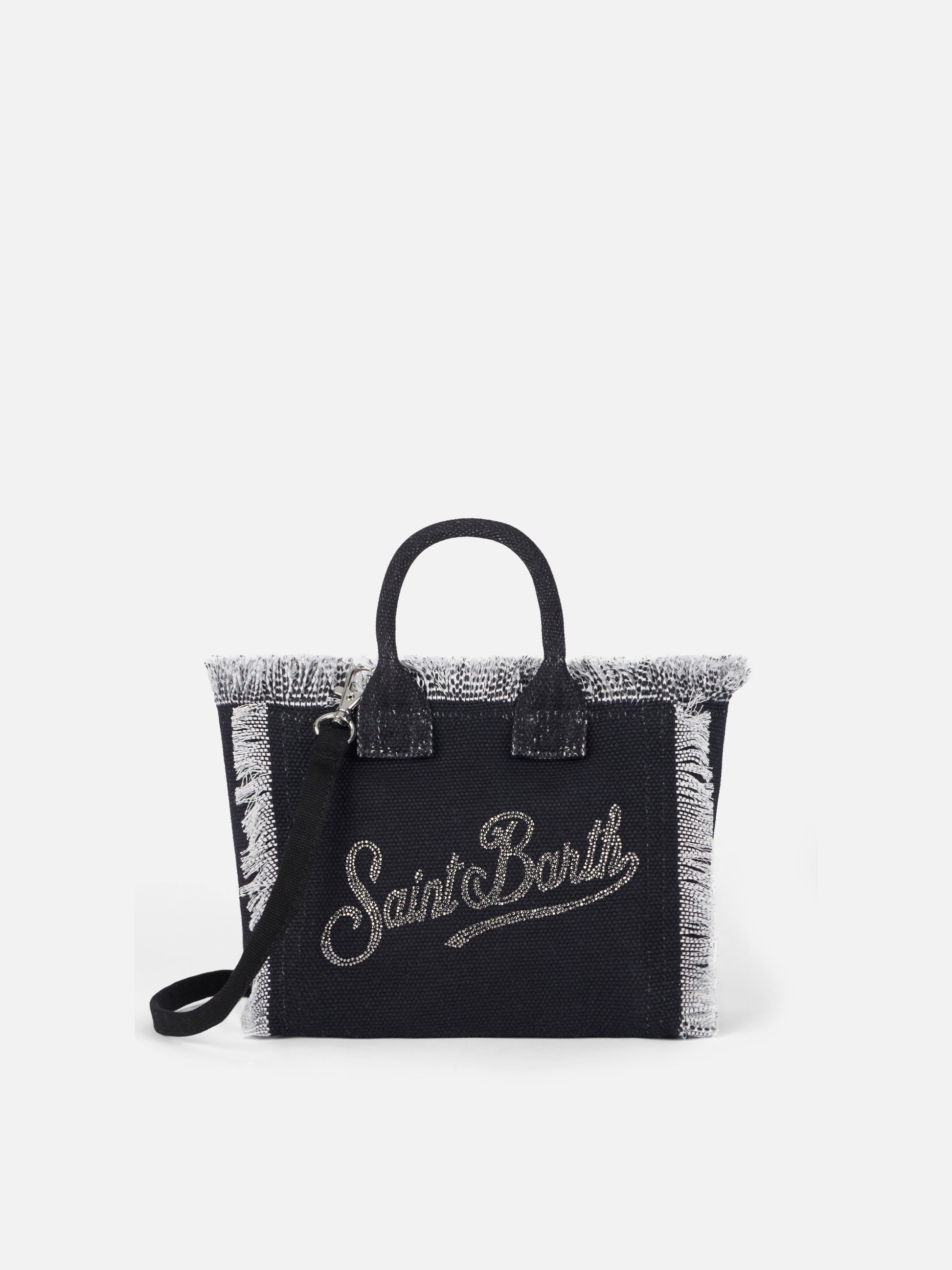 Wir präsentieren unsere Mini Vanity Canvas Bag, ein schickes Accessoire, das Komfort und Eleganz nahtlos miteinander verbindet. Diese sorgfältig aus hochwertigem Baumwoll-Canvas gefertigte Tasche verfügt über eine raffinierte Struktur für ein anspruchsvolles Erscheinungsbild. Mit ihren kompakten Abmessungen bietet sie die ideale Balance zwischen Funktionalität und stilvollem Flair. Die Tasche verfügt über einen abnehmbaren Schultergurt und bietet vielseitige Trageoptionen ganz nach Ihren Wünschen. Trotz ihrer geringeren Größe verfügt die Mini Vanity Canvas Bag über ein geräumiges Inneres und ist damit der perfekte Begleiter für viele Gelegenheiten. Mit diesem kleinen Meisterwerk können Sie Ihren einzigartigen Stil mühelos zum Ausdruck bringen. Wählen Sie aus einer Reihe von Farbtönen, die zu Ihrem Ensemble passen, und setzen Sie überall ein Statement. Erweitern Sie Ihre Accessoire-Kollektion mit dieser raffinierten und vielseitigen Mini-Canvas-Tasche, die Mode und Funktionalität nahtlos miteinander verbindet. Mini Vanity Canvas Tasche Schwarzer Baumwoll-Canvas mit exklusivem Logo aus silbernen Strasssteinen Exklusiver Saint Barth Logo-Print Reißverschluss Innere Reißverschlusstasche Mit abnehmbarem Schultergurt Maße: 18 x 16 x 9 cm