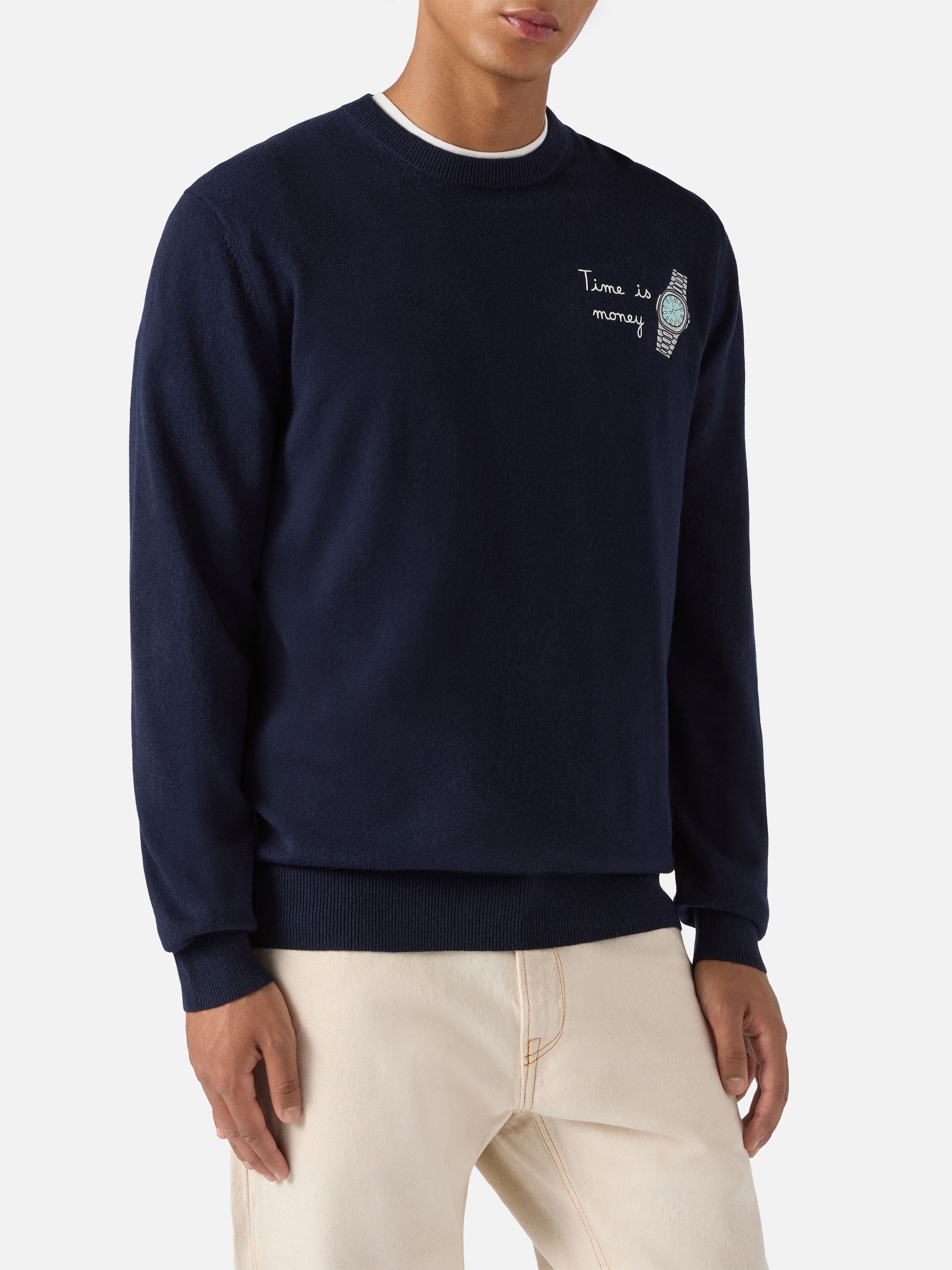 Crewneck sweater Heron Light with Time is Money clock embroidery