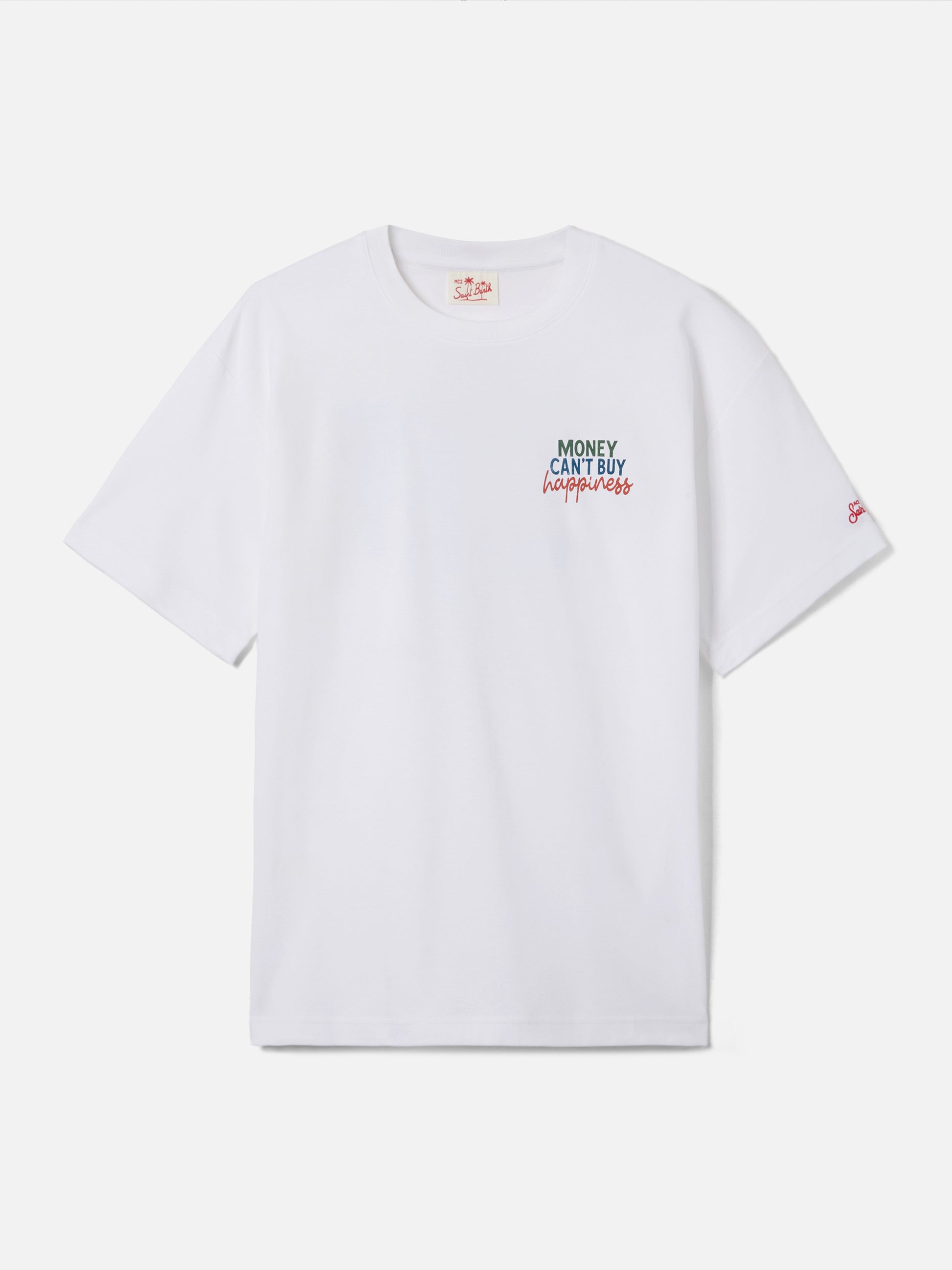 https://it.mc2saintbarth.com/de/products/delmar-t-shirt-with-money-can-t-buy-happiness-print-and-maxi-graphic-on-the-back10775856677210Delmar t-shirt with Money Can’t Buy Happiness print and maxi graphic on the back119.00https:files/UID_DLR000101525L-MAN-T-SHIRT-WHITE-MC2-MC2_5.jpghttps:files/UID_DLR000101525L-MAN-T-SHIRT-WHITE-MC2-MC2_5.jpgEURInStockT-SHIRT650948215130Alle Produkte – nur von Man649134276954AVADA - Bestseller672324452698New In - Man288164774072T-Shirts für Herren654690484570UpSelling_Man_T-ShirtsThe Delmar t-shirt is crafted from pure cotton, designed to provide comfort and a natural feel against the skin. The white solid-color design highlights the essential construction of the garment. The style features a Money Can’t Buy Happiness print on the chest, while the back is enriched with a coordinated large illustrated print depicting a summer scene with palm trees, a seaside villa and a boat, completed by the same lettering. The garment is finished with a crew neck, short sleeves and a straight silhouette with a relaxed fit.