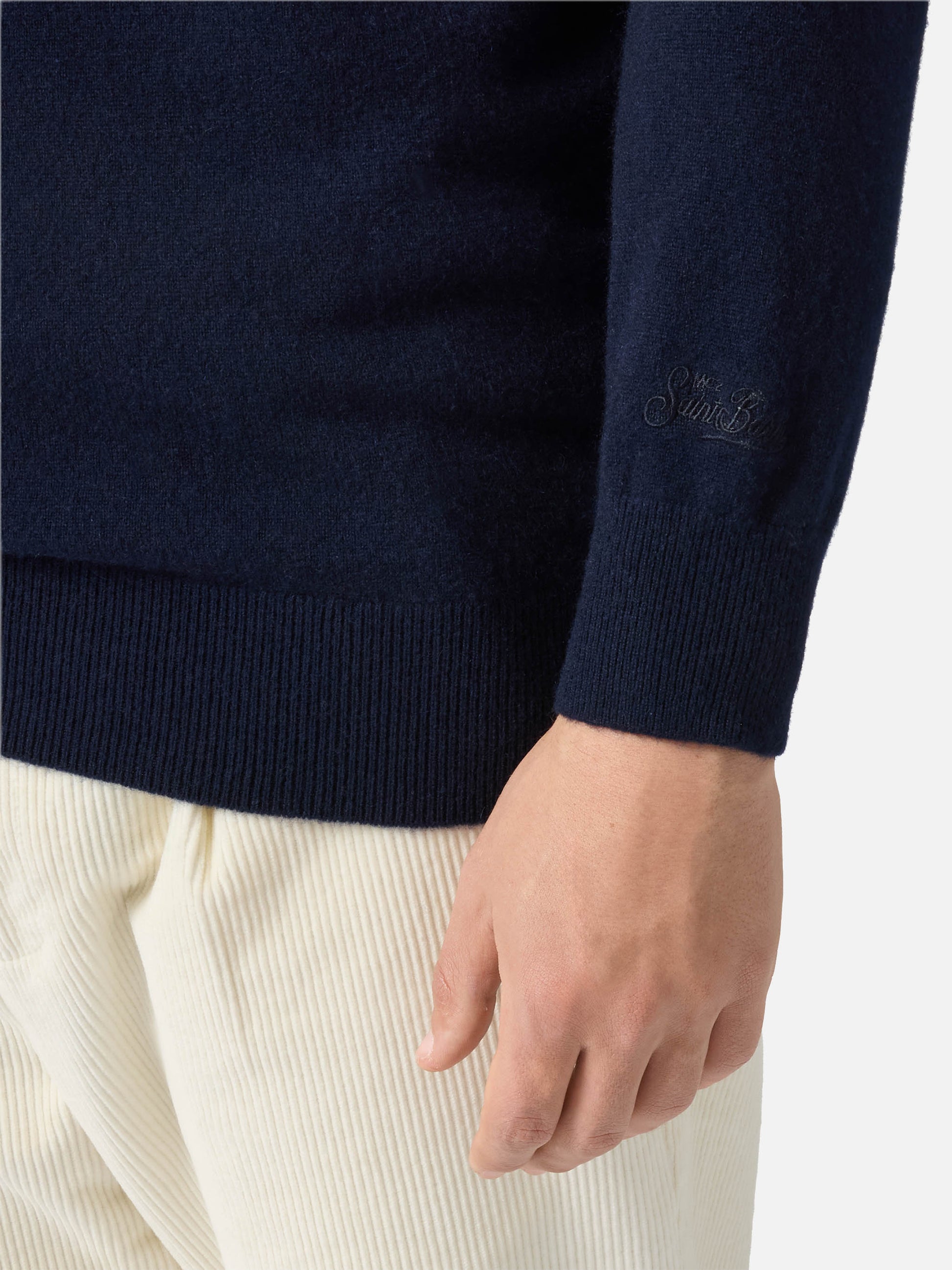 Heron Light Pullover aus 100 % blauem Kaschmir mit St. Moritz Intarsien | ST. MORITZ TOP OF THE WORLD