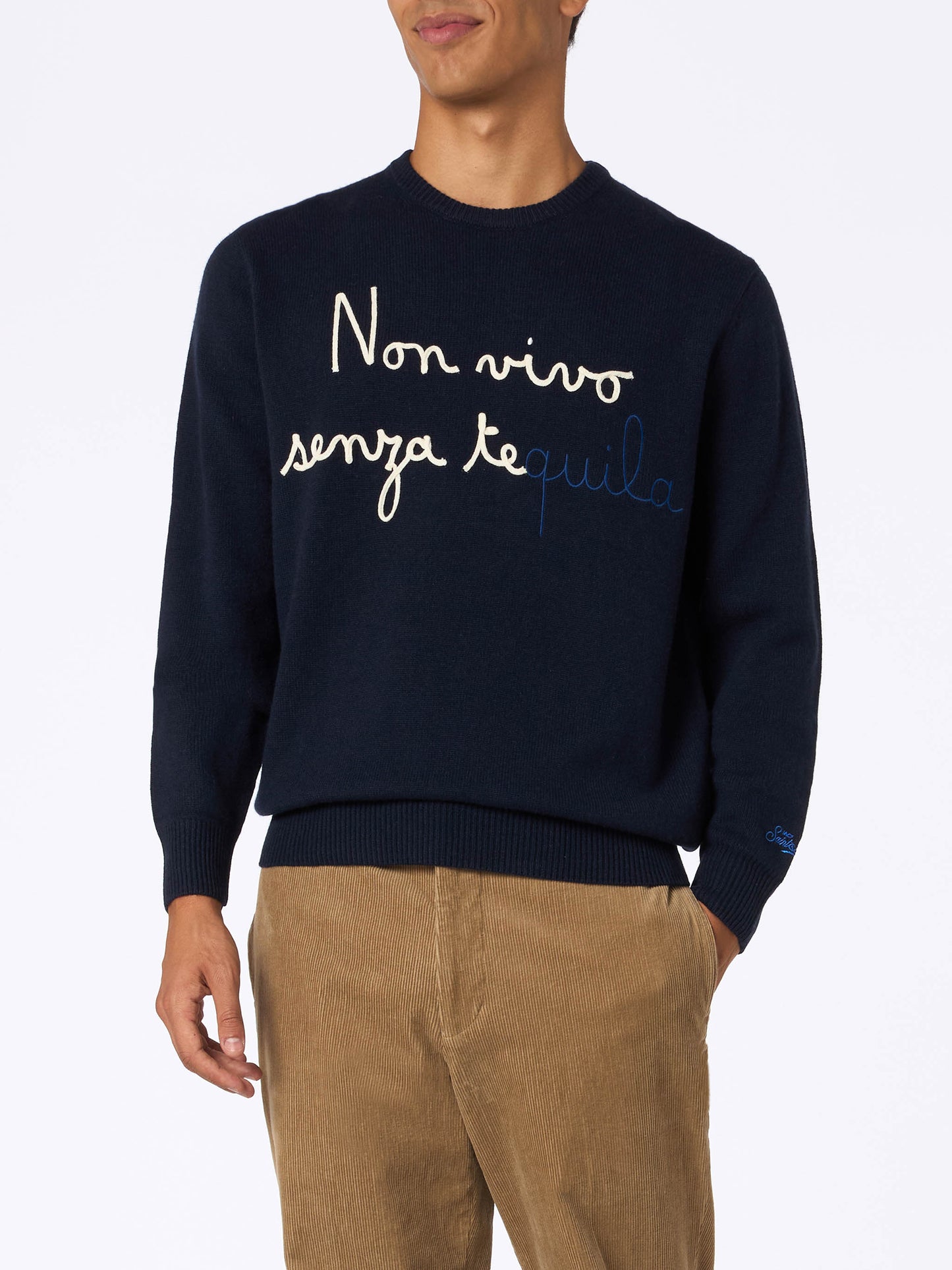 Blauer Herrenpullover Heron mit Stickerei „Non vivo senza tequila“