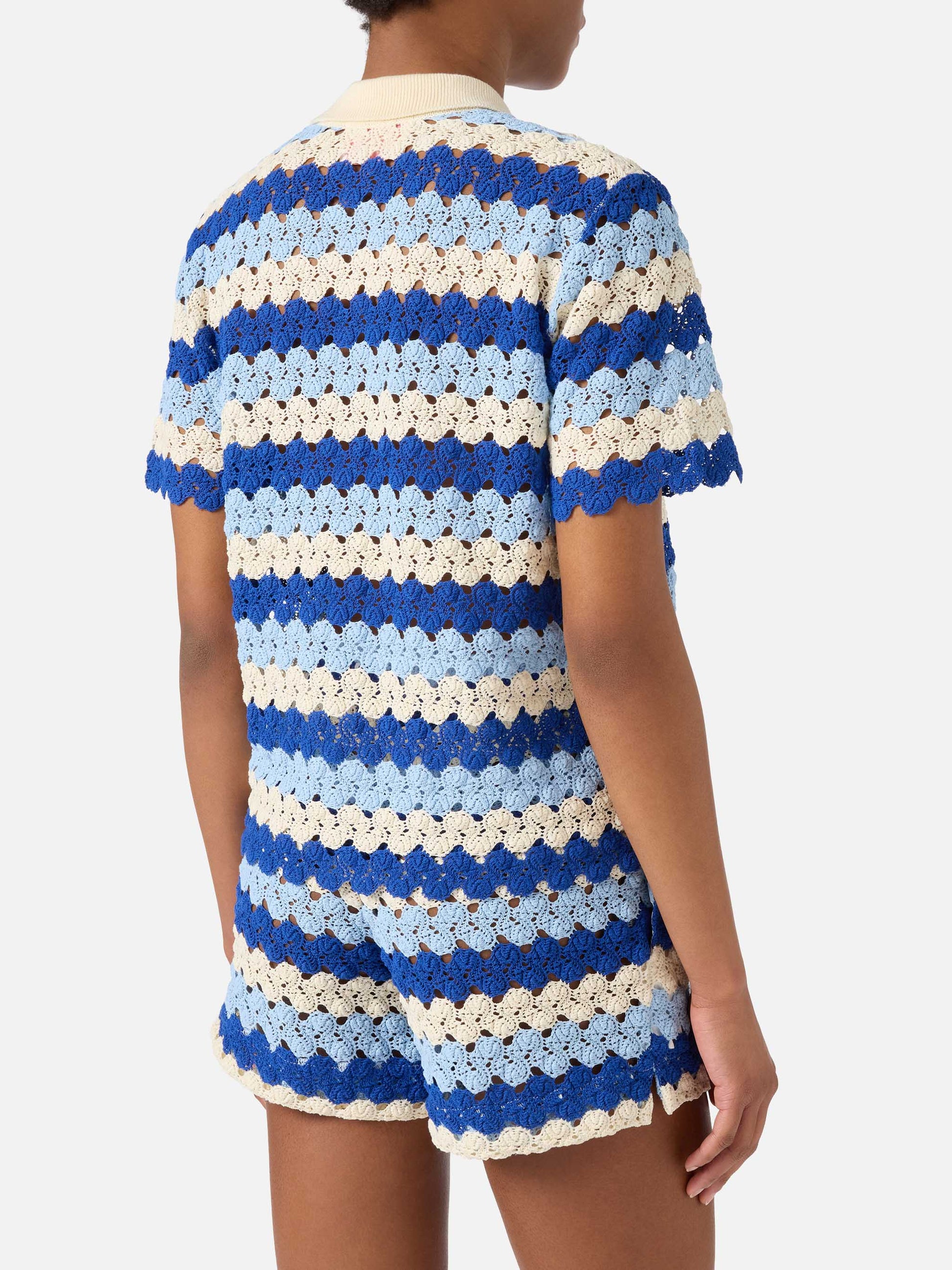 The Monet polo is crafted from crochet-effect cotton knit, lightweight and breathable, designed to offer comfort and a pleasant feel on the skin. The horizontal striped design in shades of blue, light blue and cream defines the garment with a distinctive graphic aesthetic. The style features a polo collar and front button closure, enhancing the relaxed construction of the garment. The piece is completed by short sleeves and a straight silhouette with regular fit.
