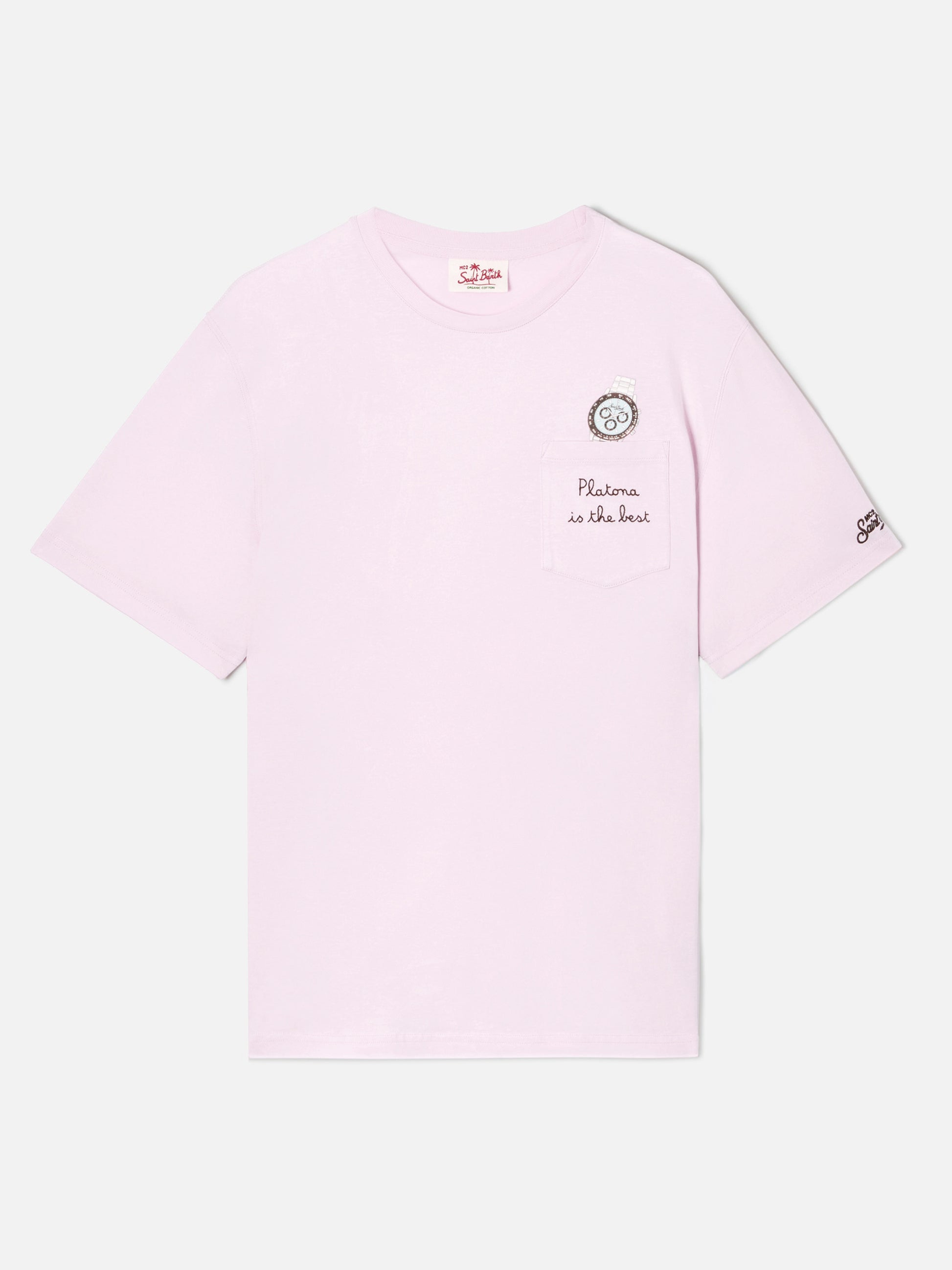 Pink Austin t-shirt with watch and Platona Is The Best embroidery