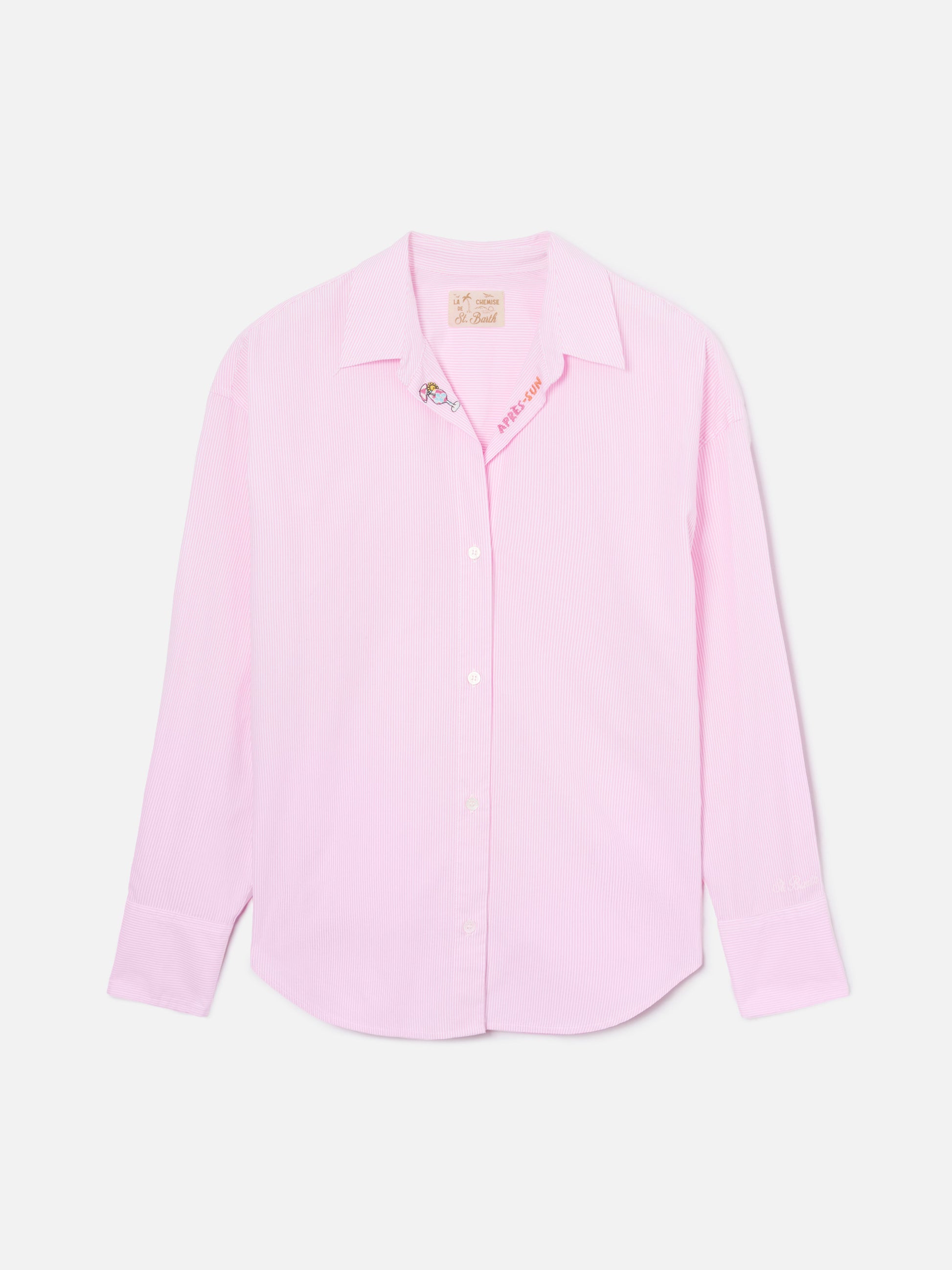 The Cristal shirt is crafted from pure cotton poplin, a lightweight and breathable fabric designed to provide comfort and freshness. The pink and white vertical striped design defines the garment with a distinctive graphic aesthetic. The style features a classic collar and front button closure with logo buttons. The design is enhanced by the Après Sun contrast embroidery on the neckline and a cocktail embroidery on the collar, distinctive graphic details that characterize the style. The garment is completed by the logo embroidery on the sleeve and a central back pleat that defines the structure of the piece. The oversize silhouette offers a relaxed and comfortable fit.