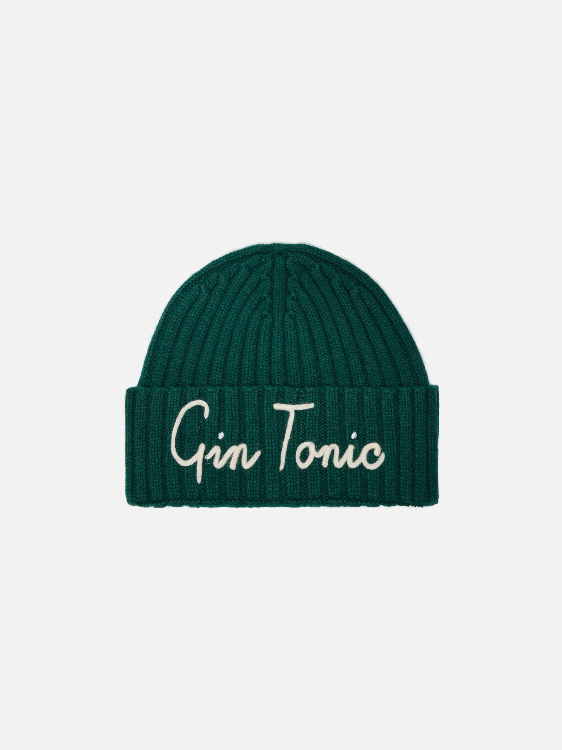 Wengen beanie in cashmere blend in British green with Gin Tonic embroidery