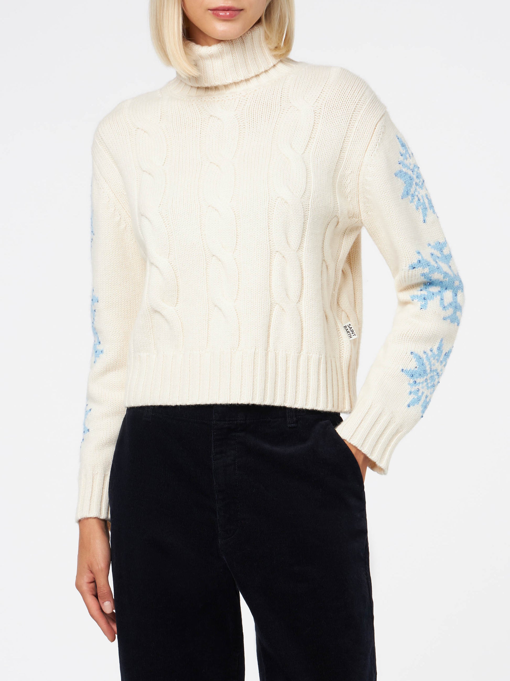 Rollkragenpullover für Damen mit Flechtmuster und Schneeflocken-Strasssteinen