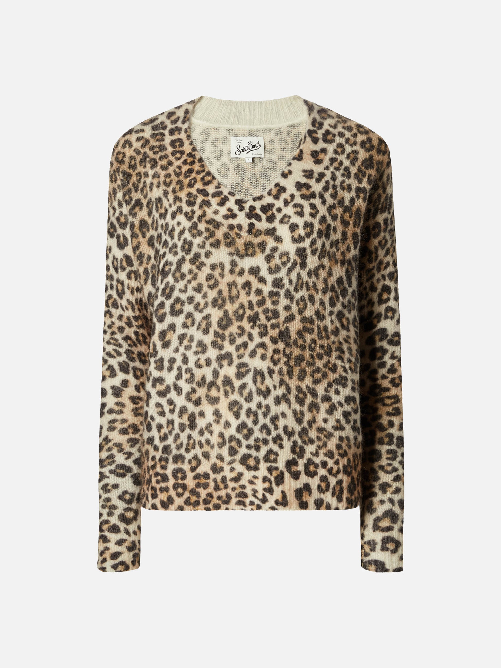 Pullover con scollo a V Elara in misto mohair cammello con stampa leopardata
