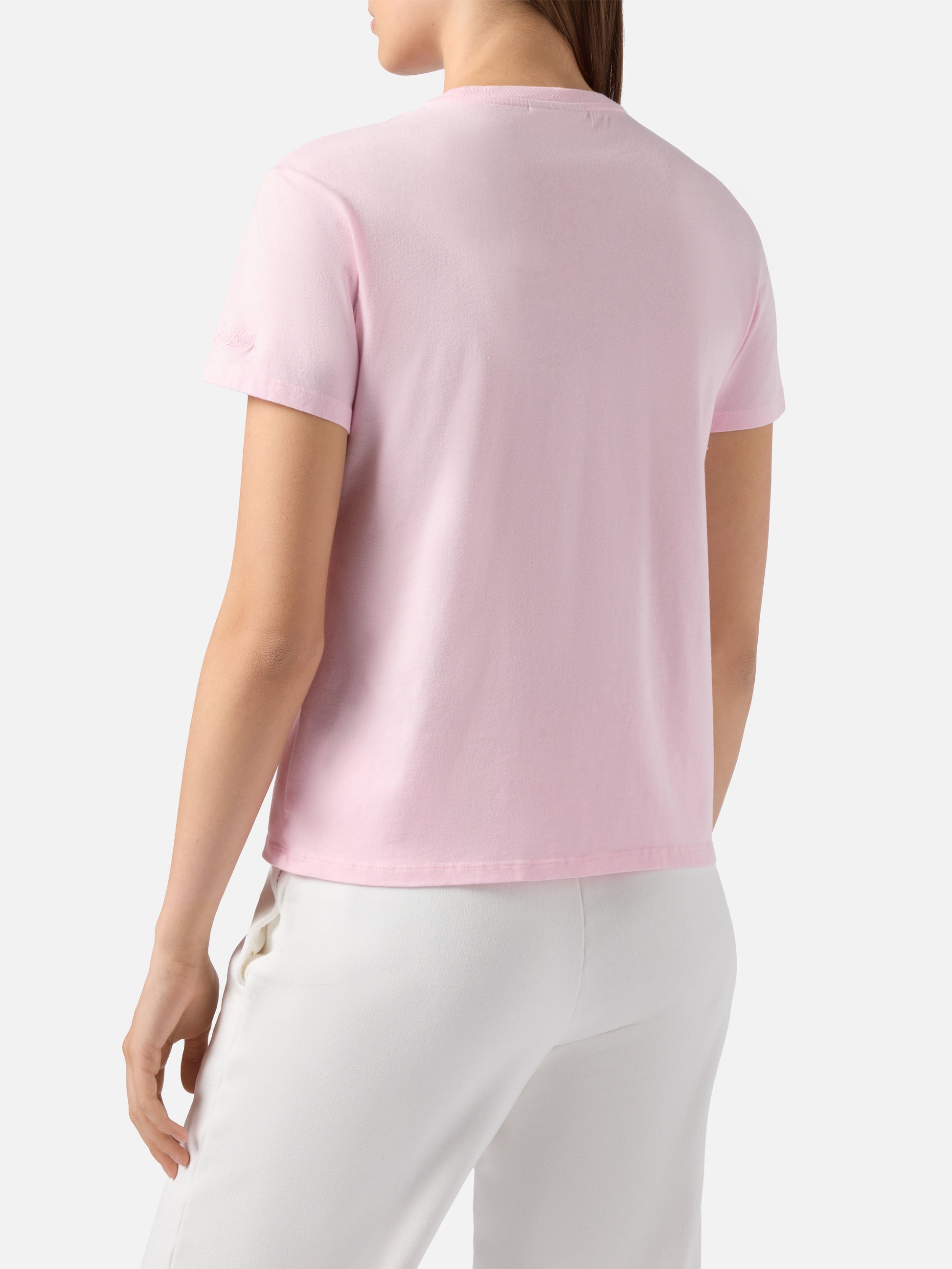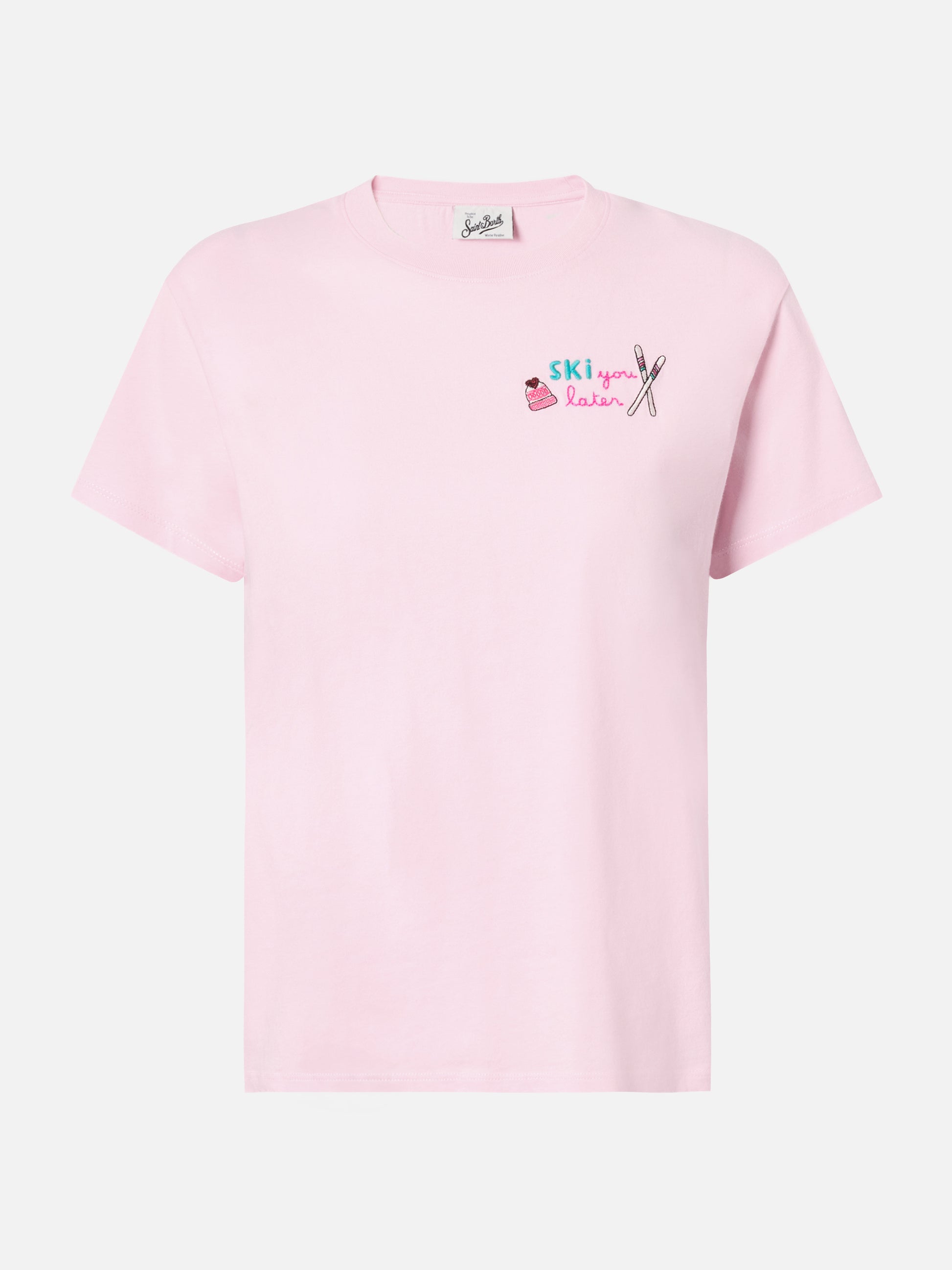 T-shirt Emilie in cotone rosa con ricamo Ski you later