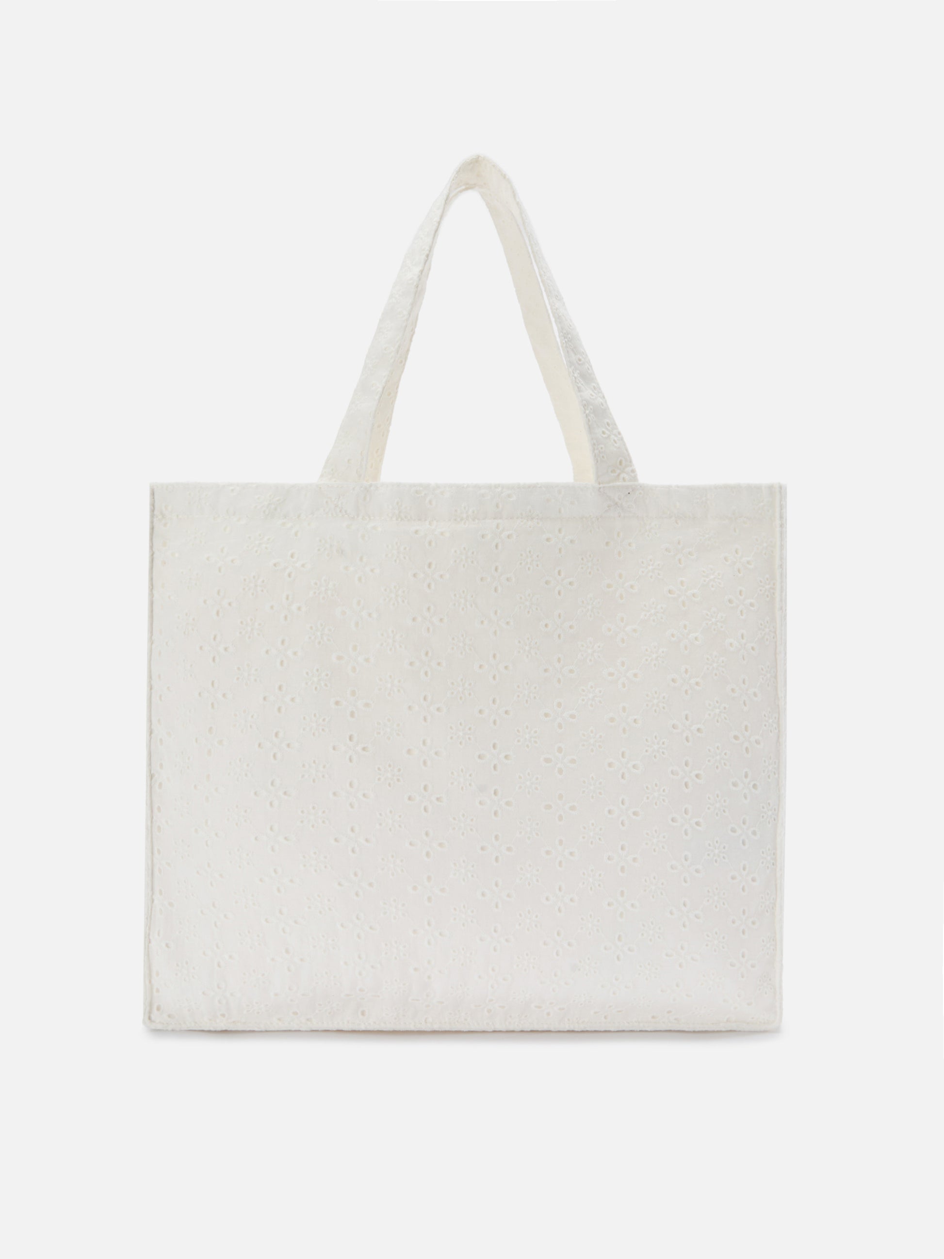 Realizzata in cotone sangallo bianco, la borsa Essential si distingue per il design morbido e capiente, ideale per il mare e il tempo libero. Il maxi logo stampato a contrasto sul fronte valorizza il tessuto lavorato con un tocco distintivo. I doppi manici permettono di portarla comodamente a spalla o a mano.