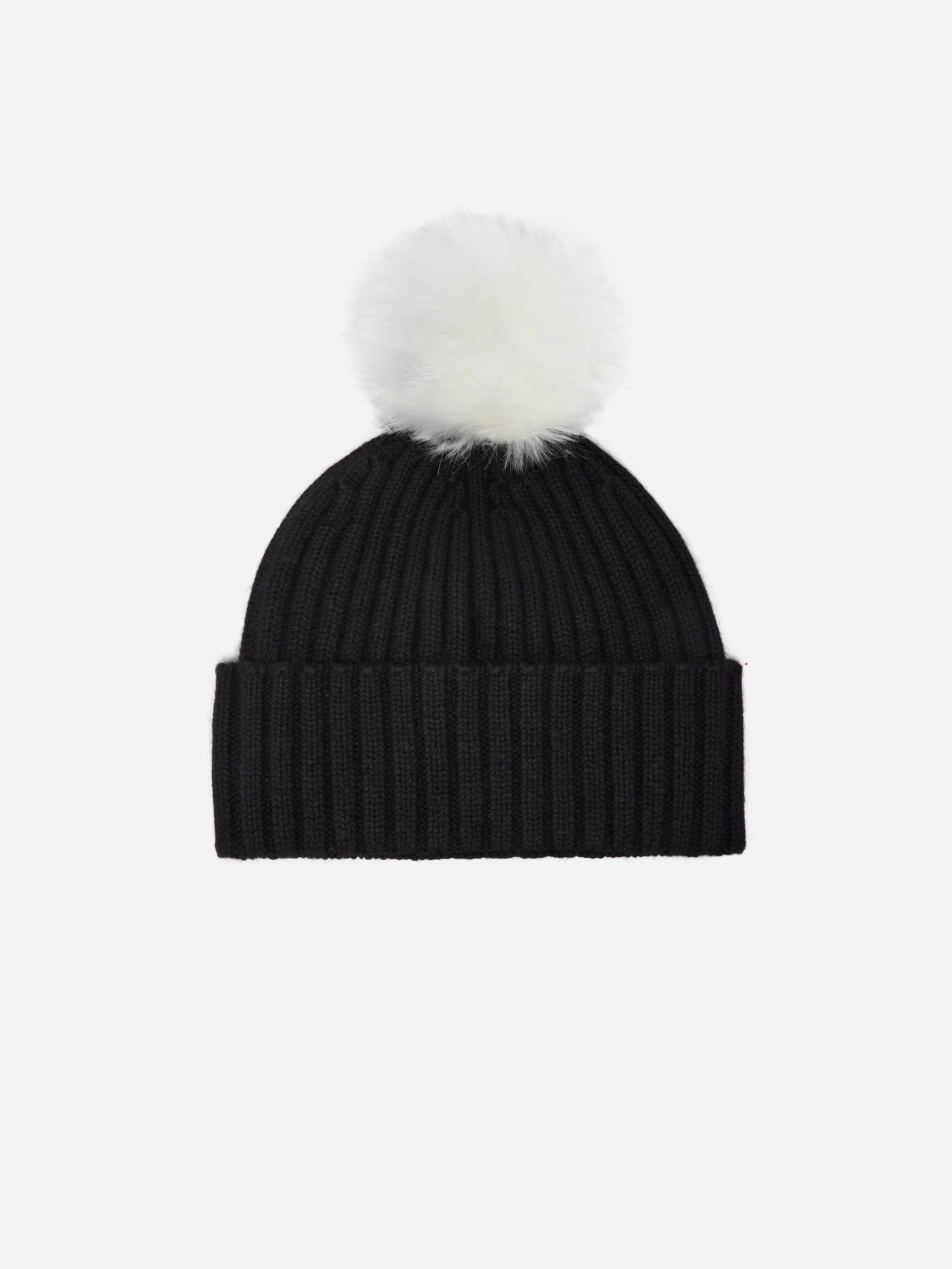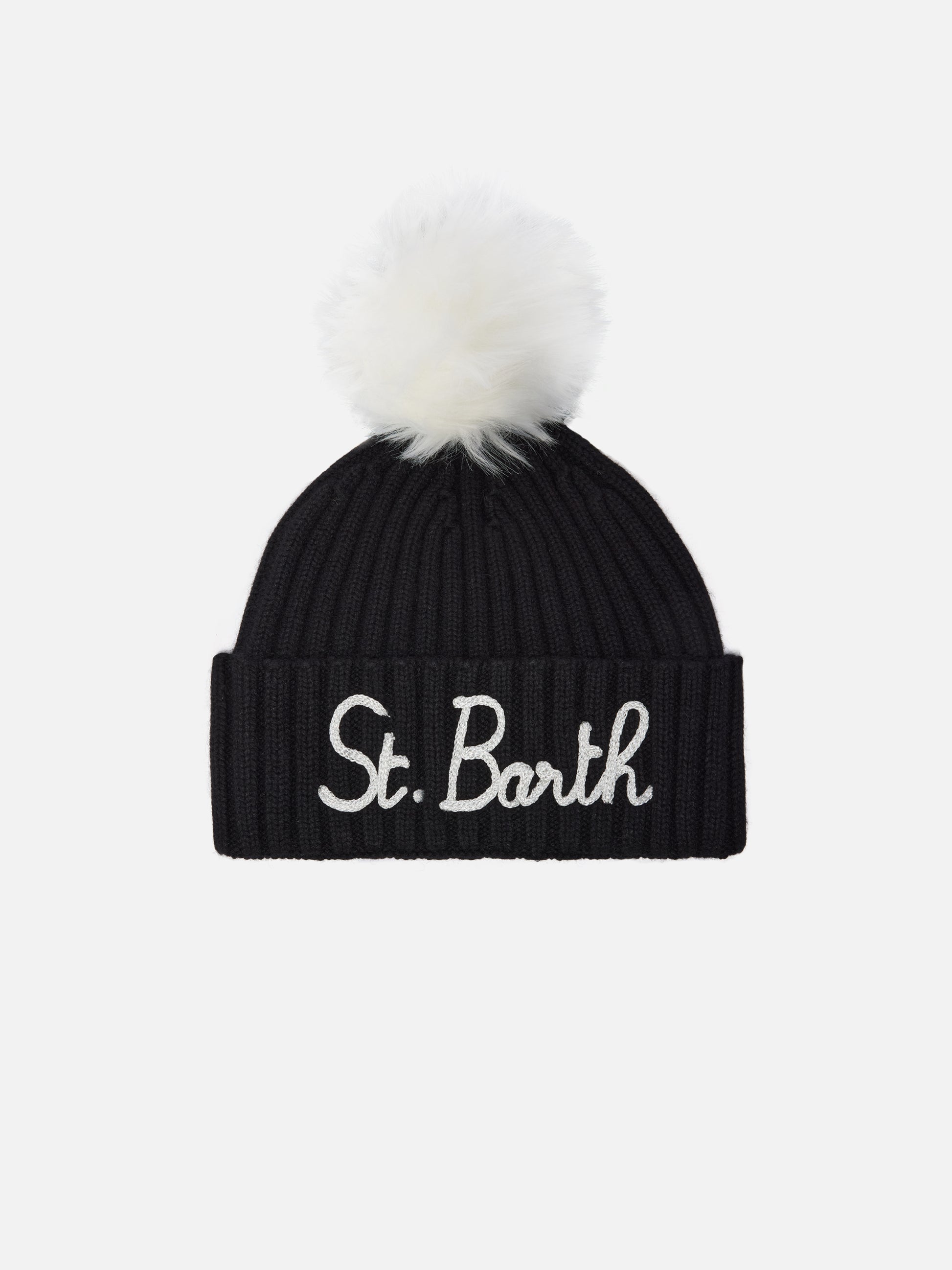 Berretto Wengen in misto cashmere nero con ricamo St. Barth e pompon