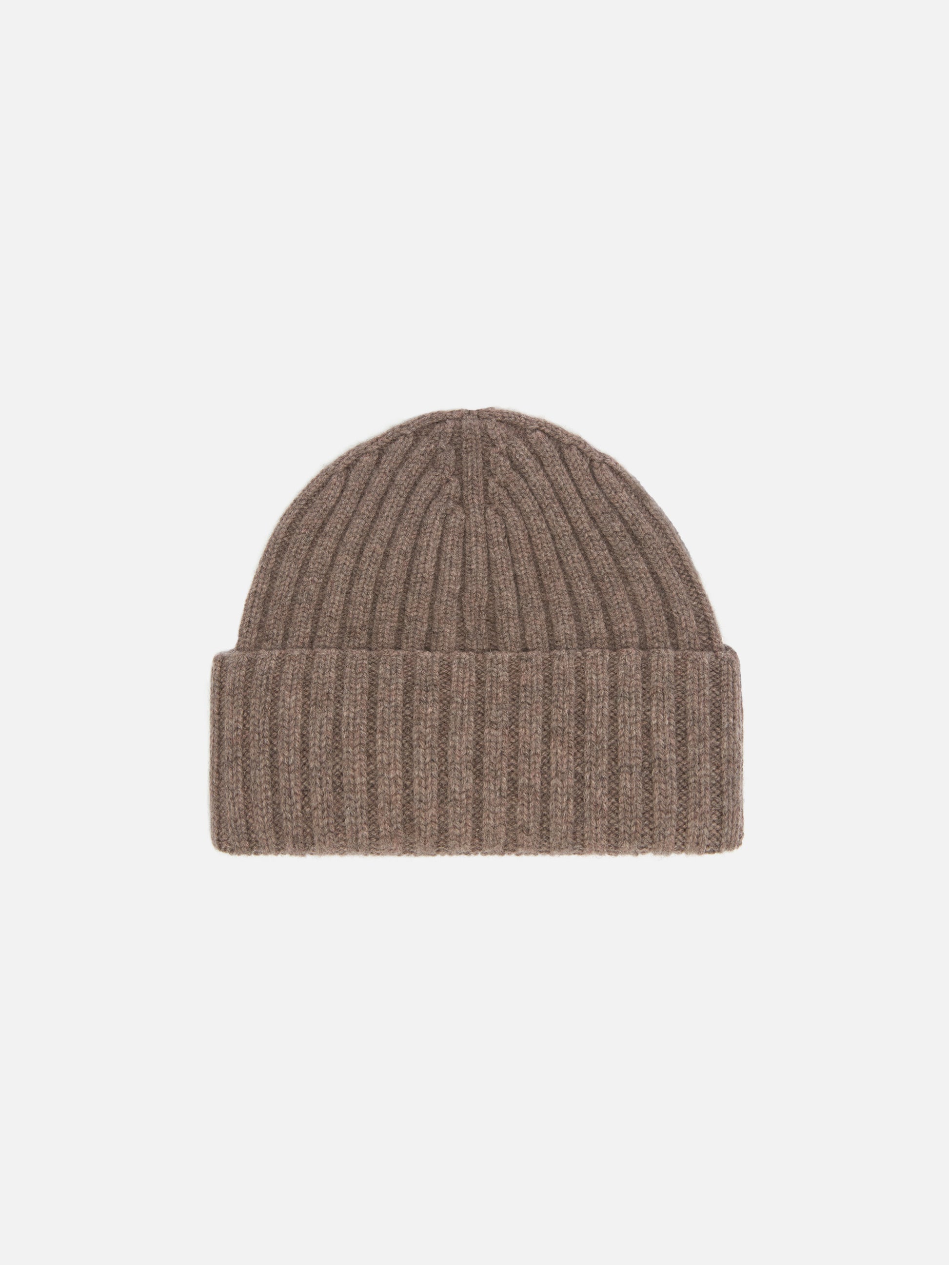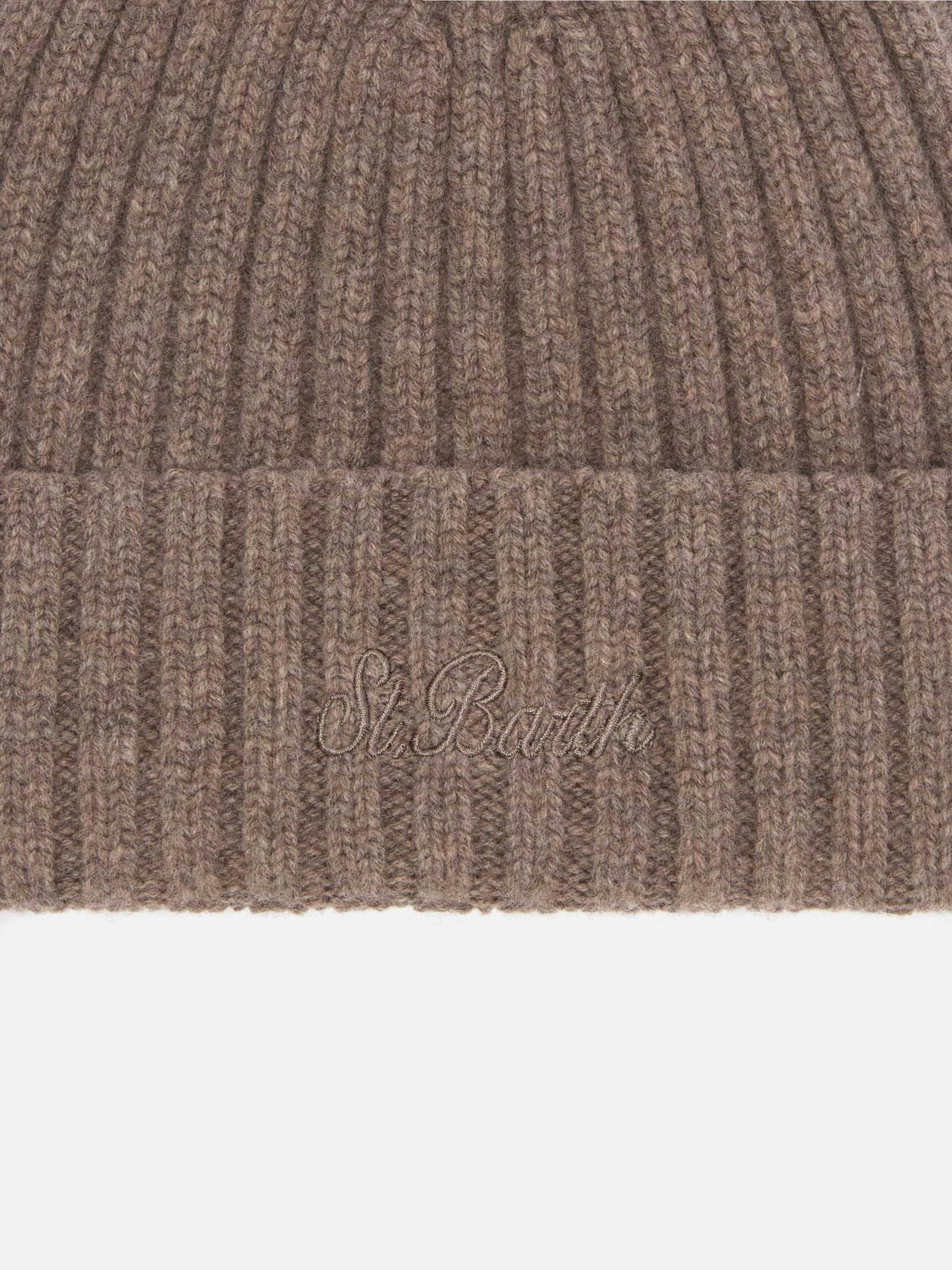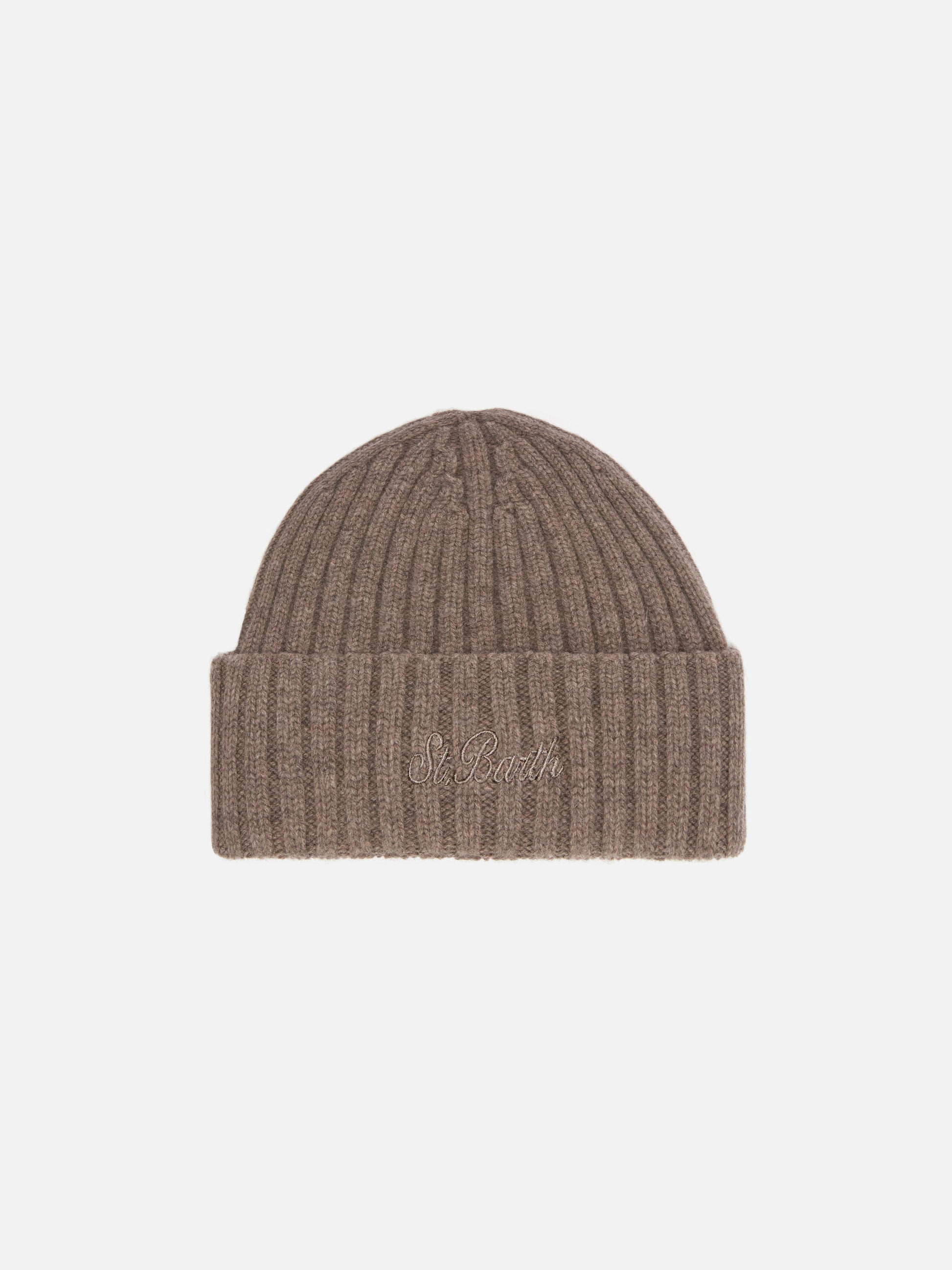 Berretto Wengen in lana nocciola con ricamo St. Barth sul risvolto