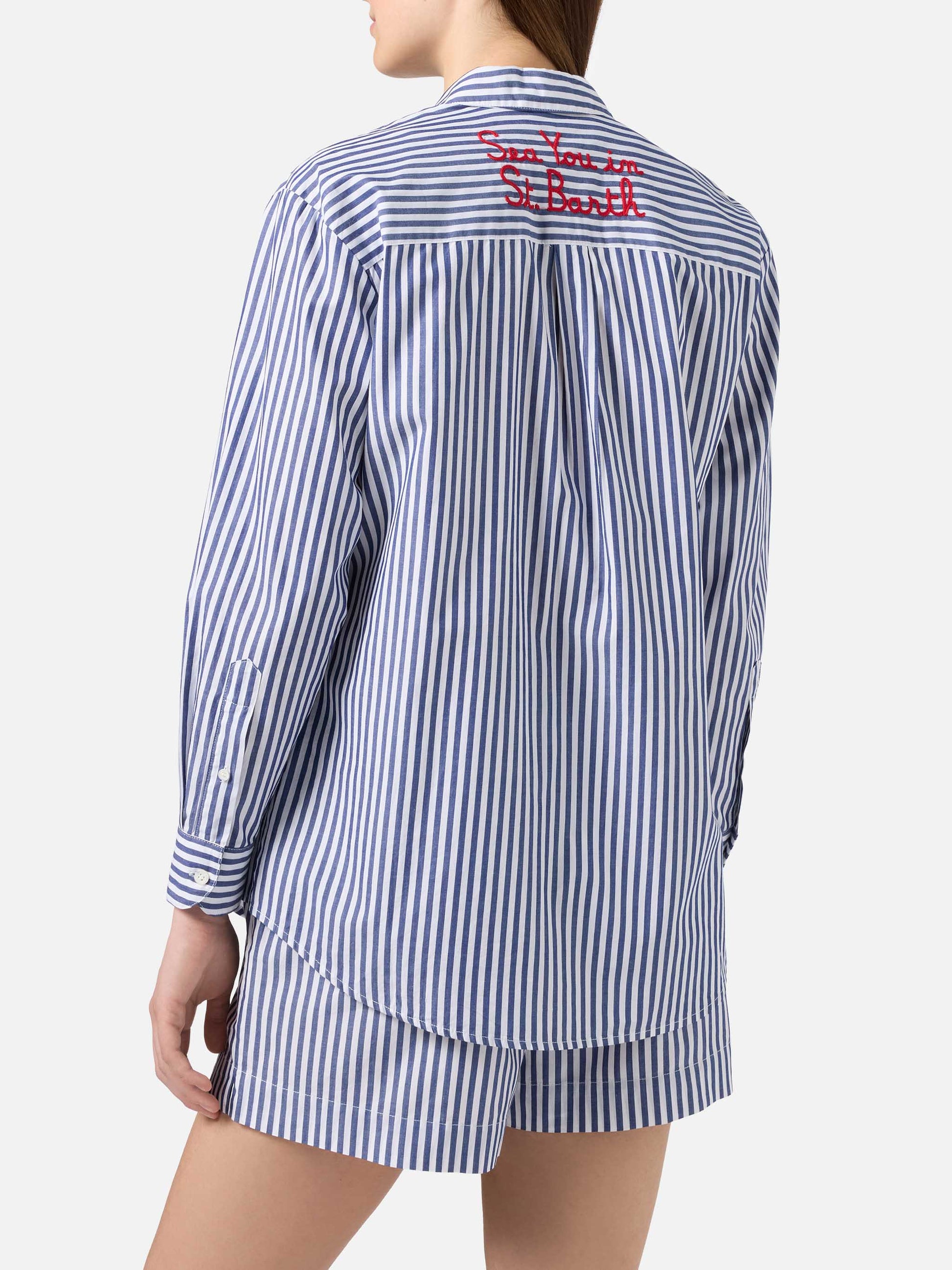 Brigitte shirt with blue stripes and See You In Saint Barth embroidery