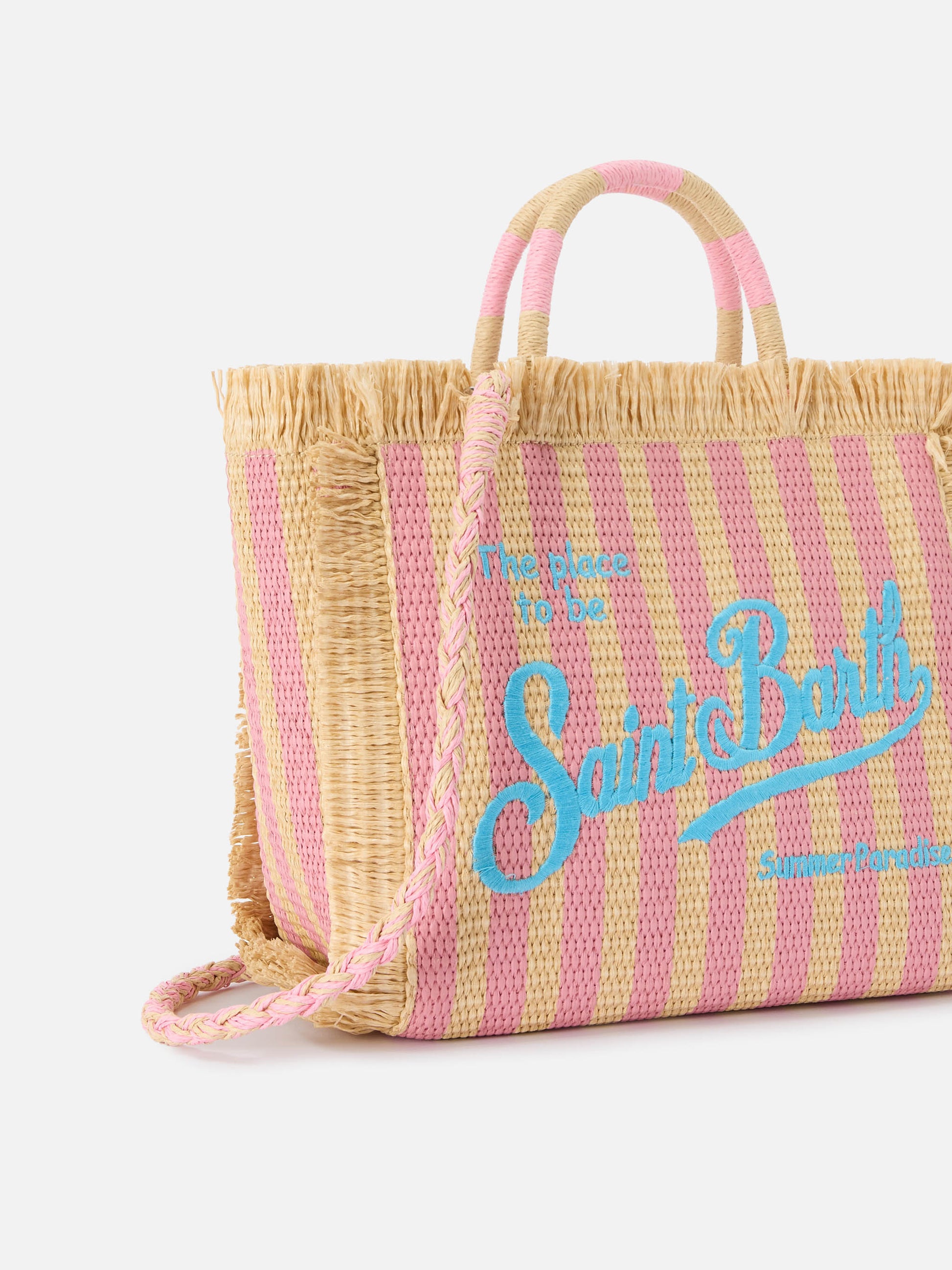 The Colette bag is crafted from striped straw effect fabric with a semi structured silhouette. The contrasting embroidered logo enhances its summer character, while the fringed edges add movement to the design. Featuring an adjustable and removable shoulder strap, it combines practicality with seasonal style.