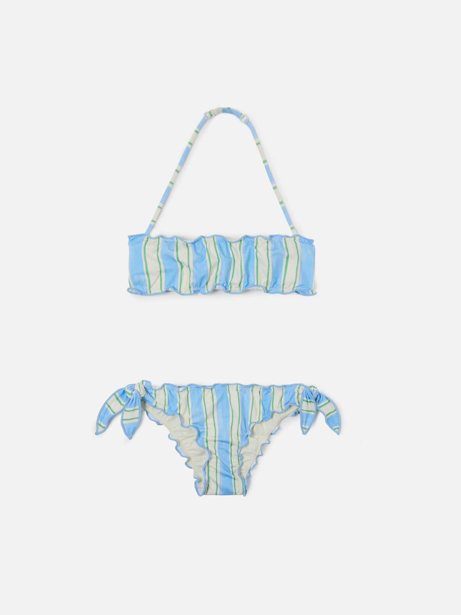 The Emy bikini is crafted from stretch fabric featuring white, light blue and green vertical stripes. The striped pattern gives the style a fresh and bright summer look. It features a bandeau top with ruffled edges and adjustable tie straps, paired with bottoms designed with a size-differentiated construction. The garment is fully lined and offers a slim fit.