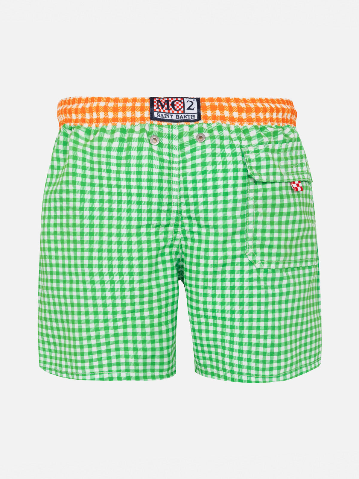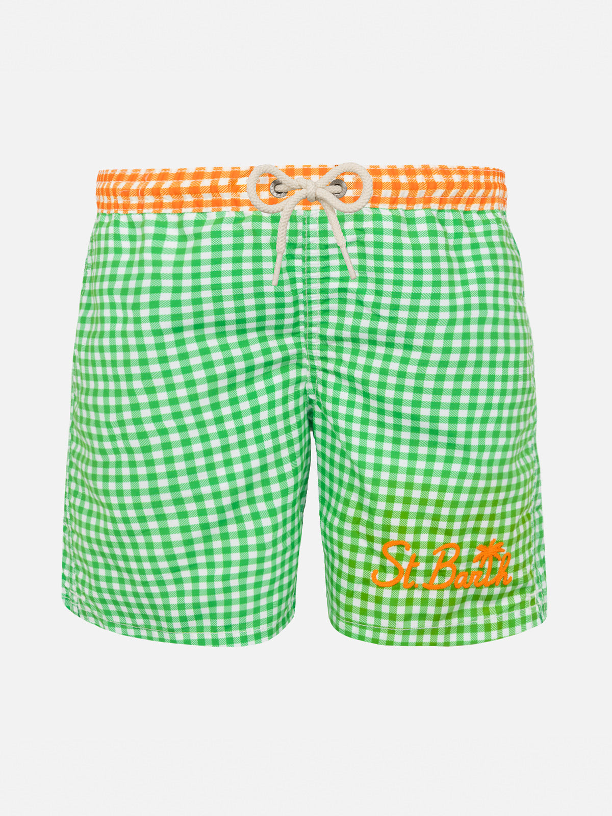 Green gingham boy's swim shorts with embroidery