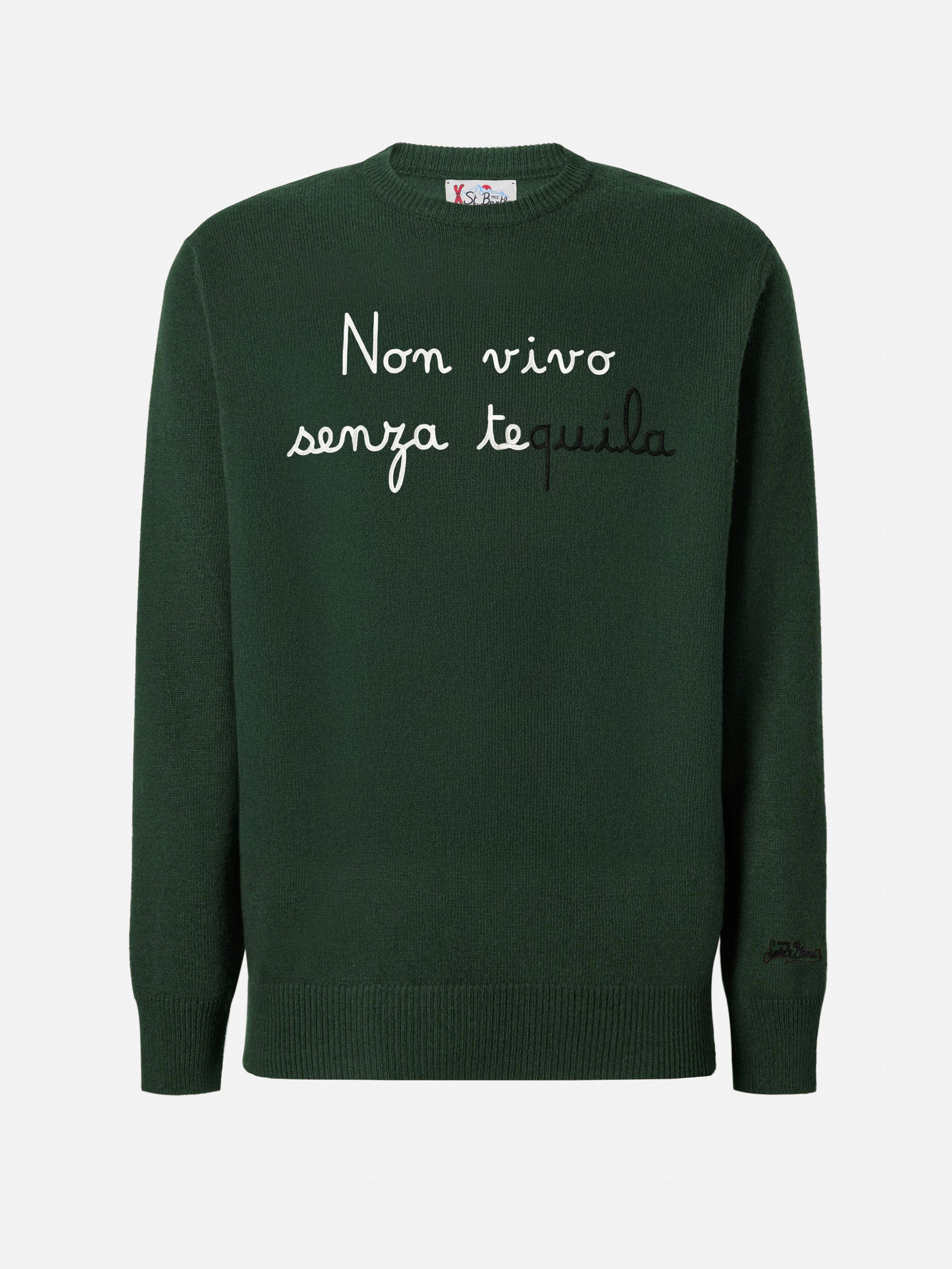 Heron green sweater with Non vivo senza tequila lettering