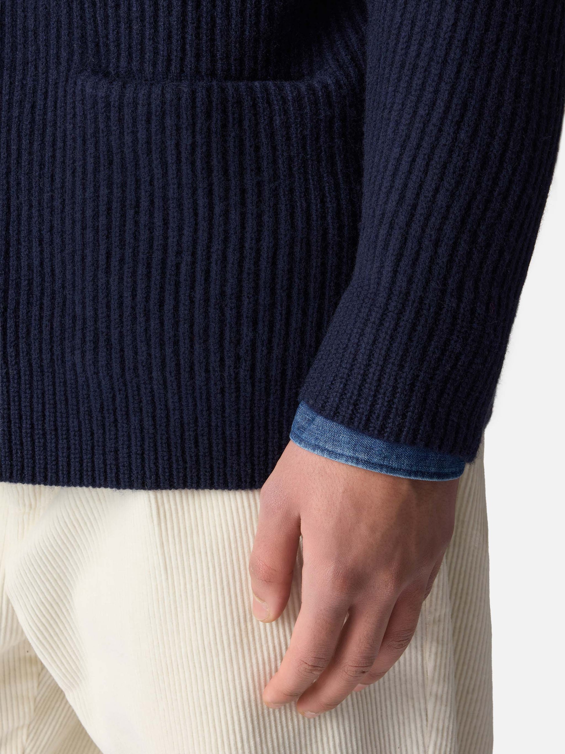 Man shawl collar blue ribbed cardigan with pockets and patch