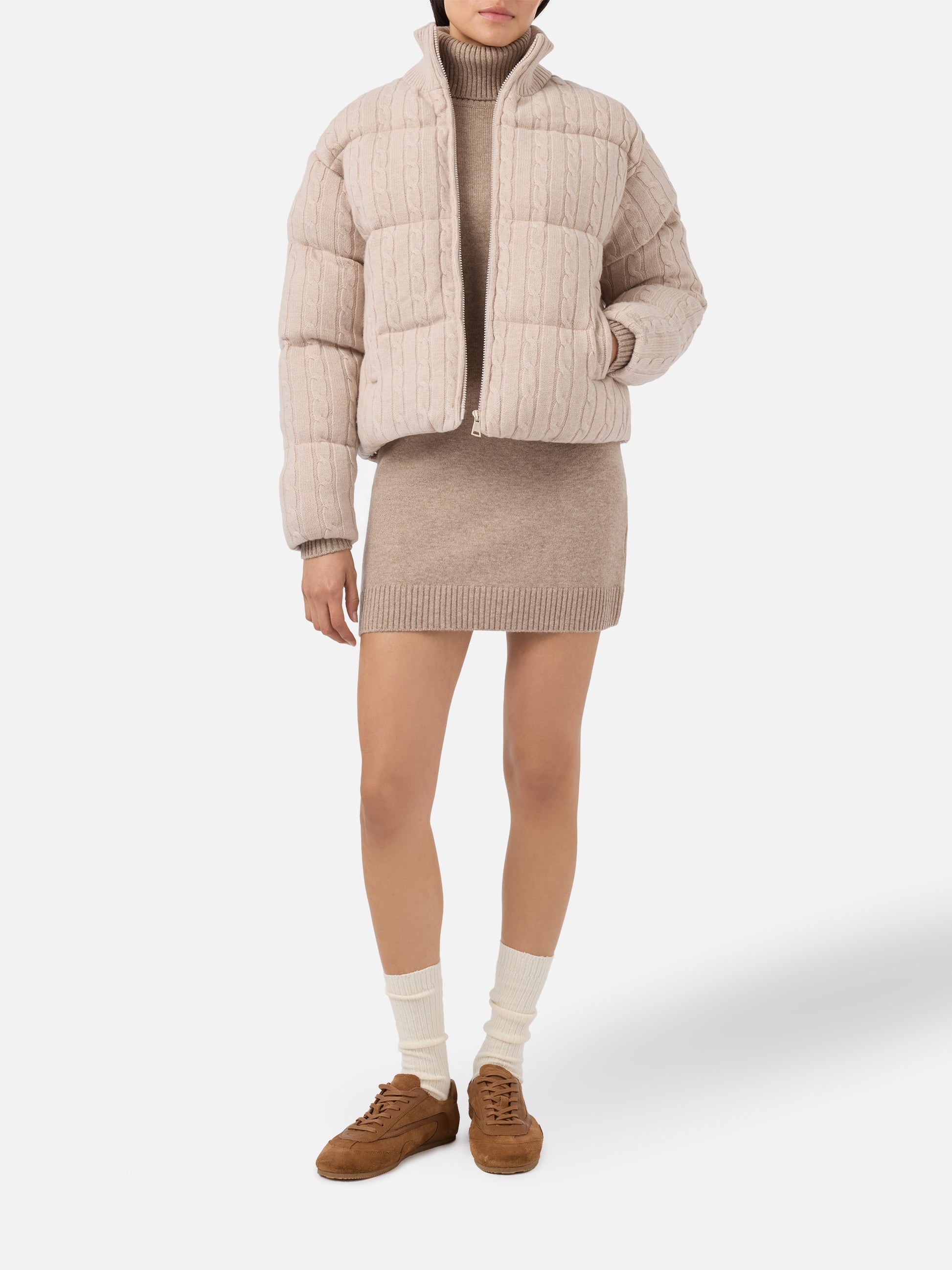 Mya is the knit-jacket that balances warmth and structure: cable knit, ribbed high neck and padded interior for premium comfort from commuting to weekend.