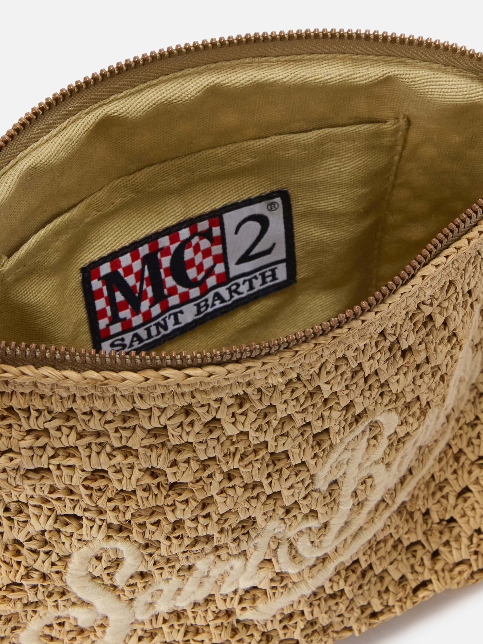 The pouch is crafted from woven raffia, ideal for summer days and leisure moments. The solid color design enhances the natural texture of the material, finished with a contrasting embroidered logo. The zip closure and lined interior ensure practicality, while the external raffia strap allows you to carry it comfortably on your wrist.