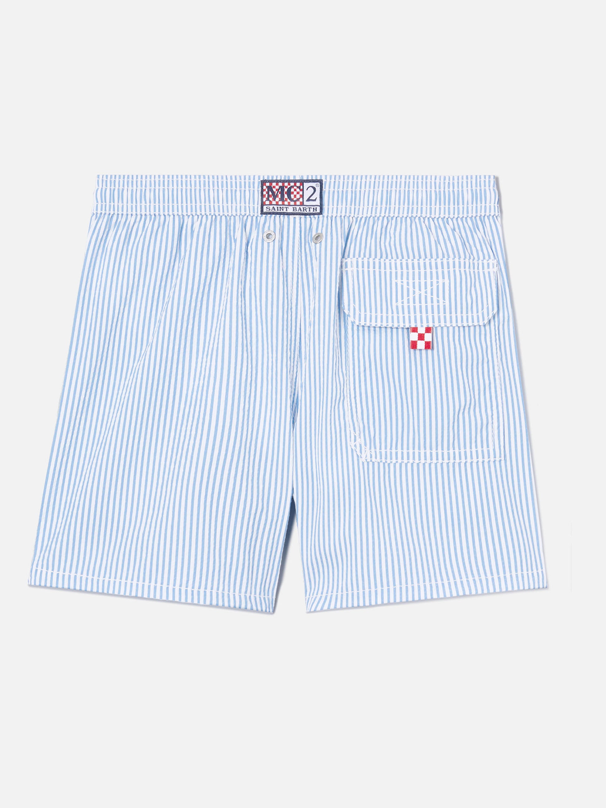 Patmos Jr seersucker swim shorts striped with St. Barth embroidery