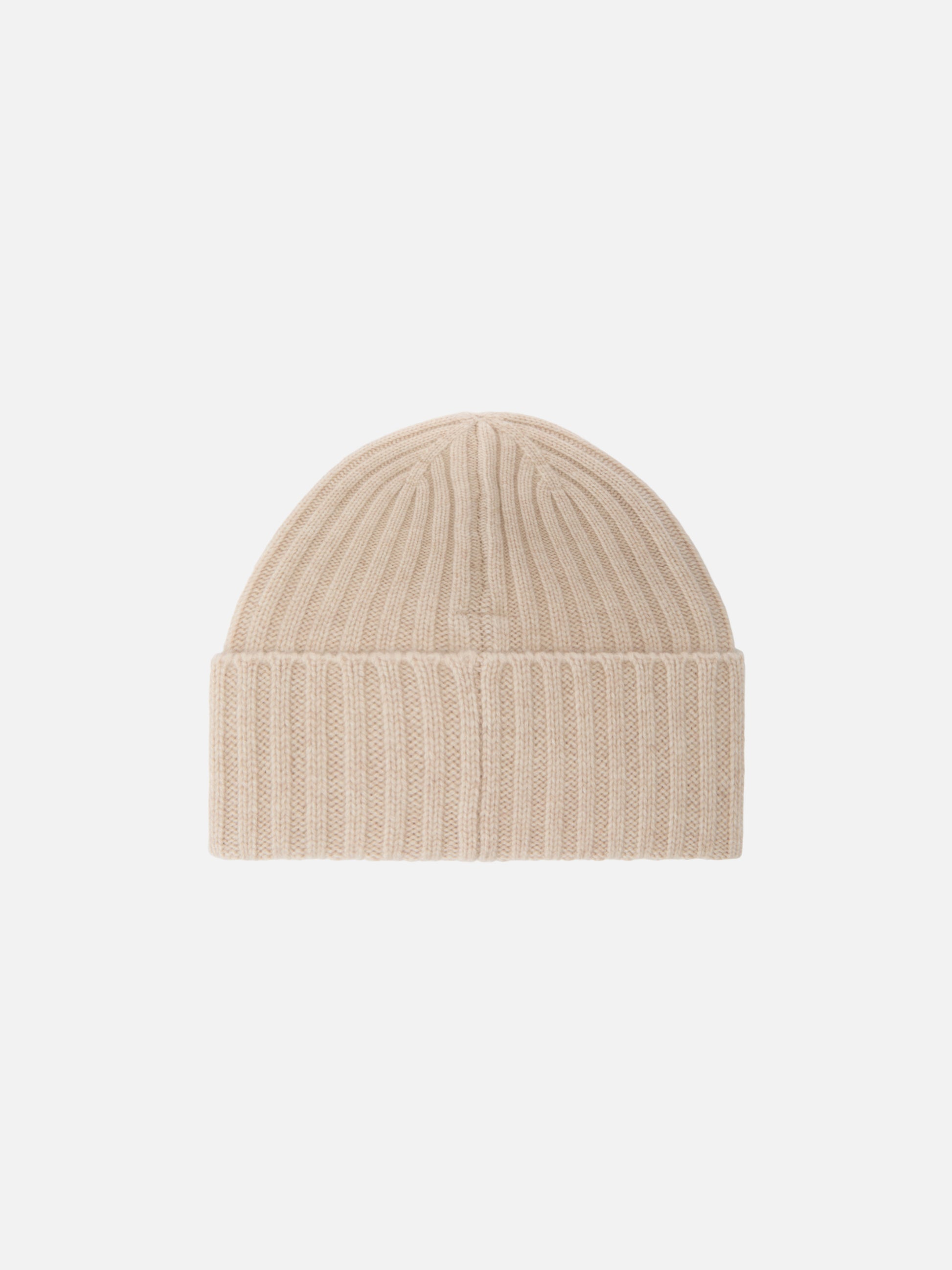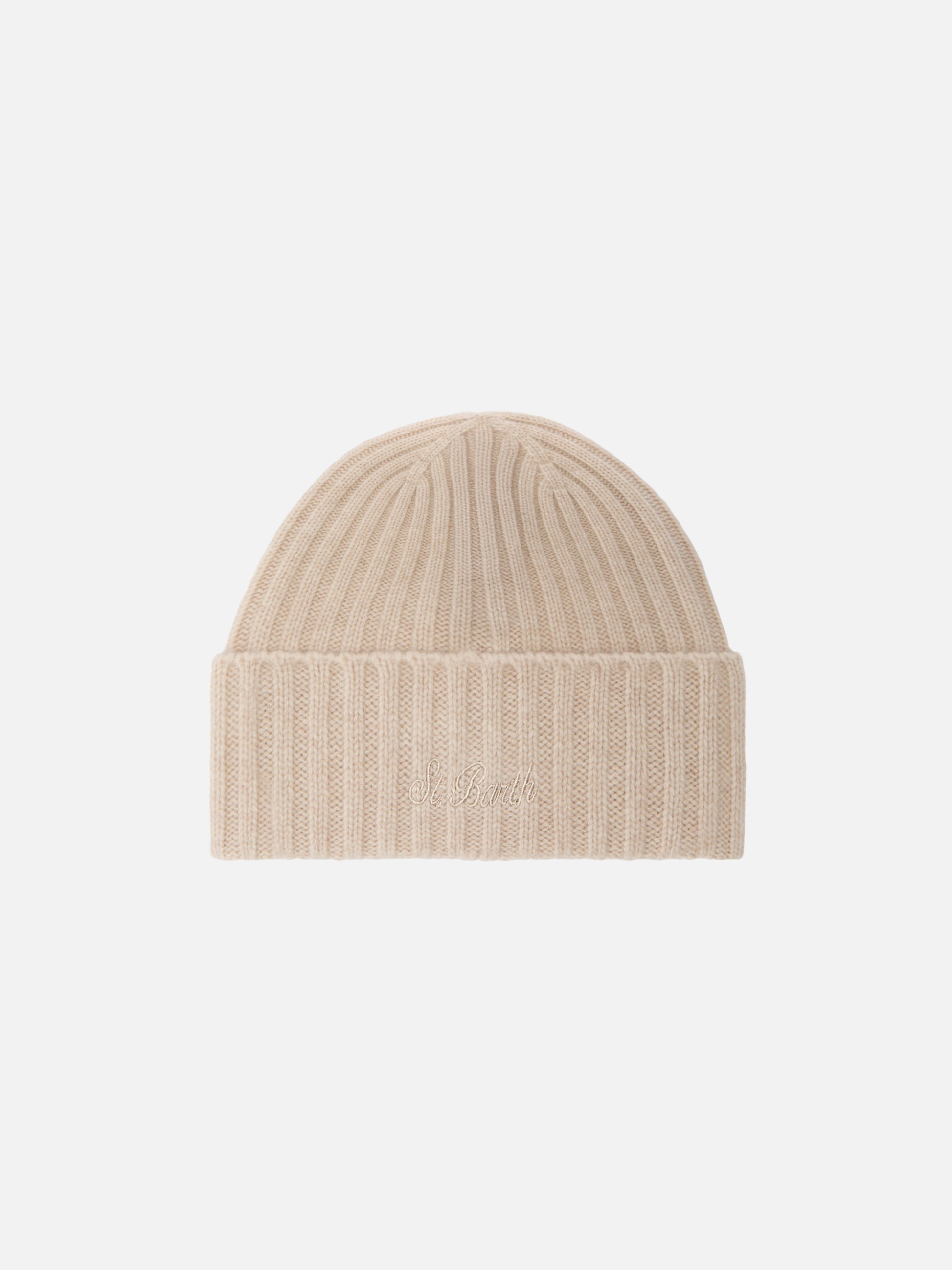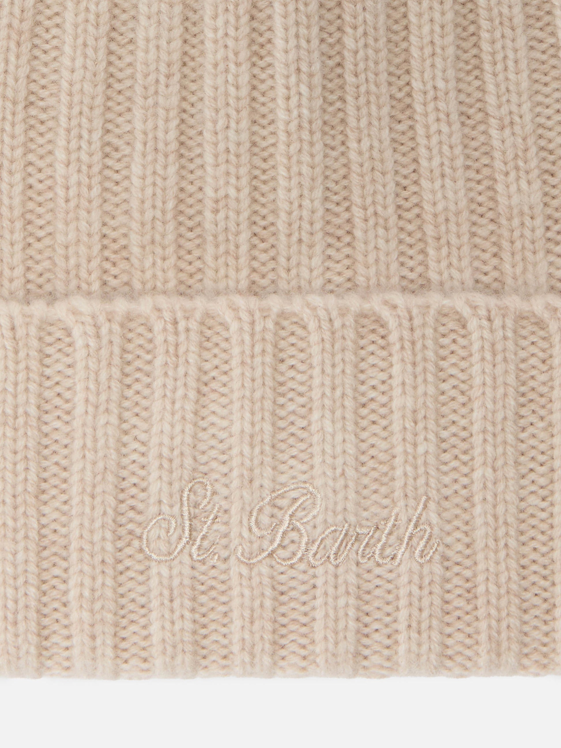 Wengen beanie in beige melange cashmere with St. Barth embroidery on the turn-up