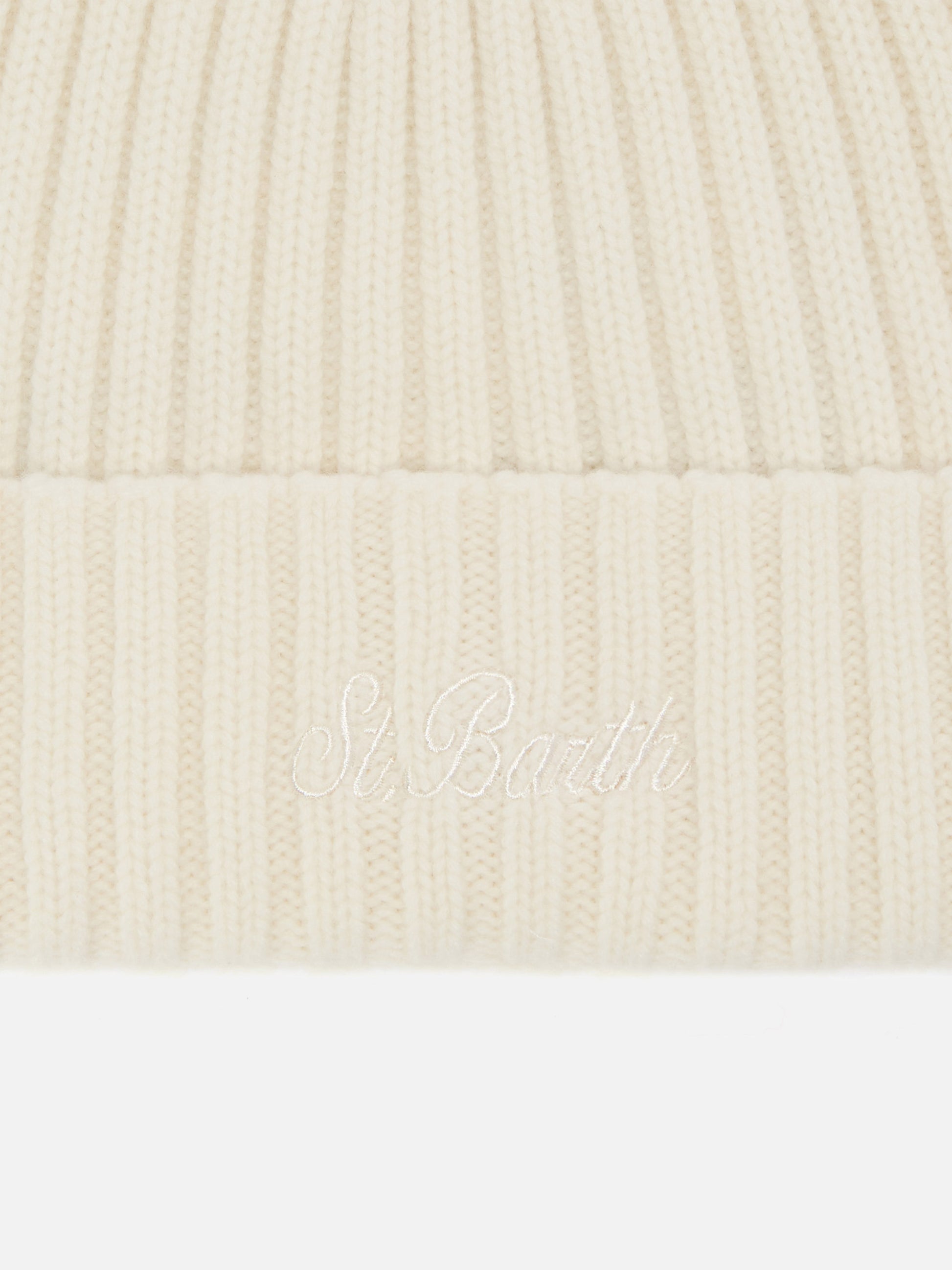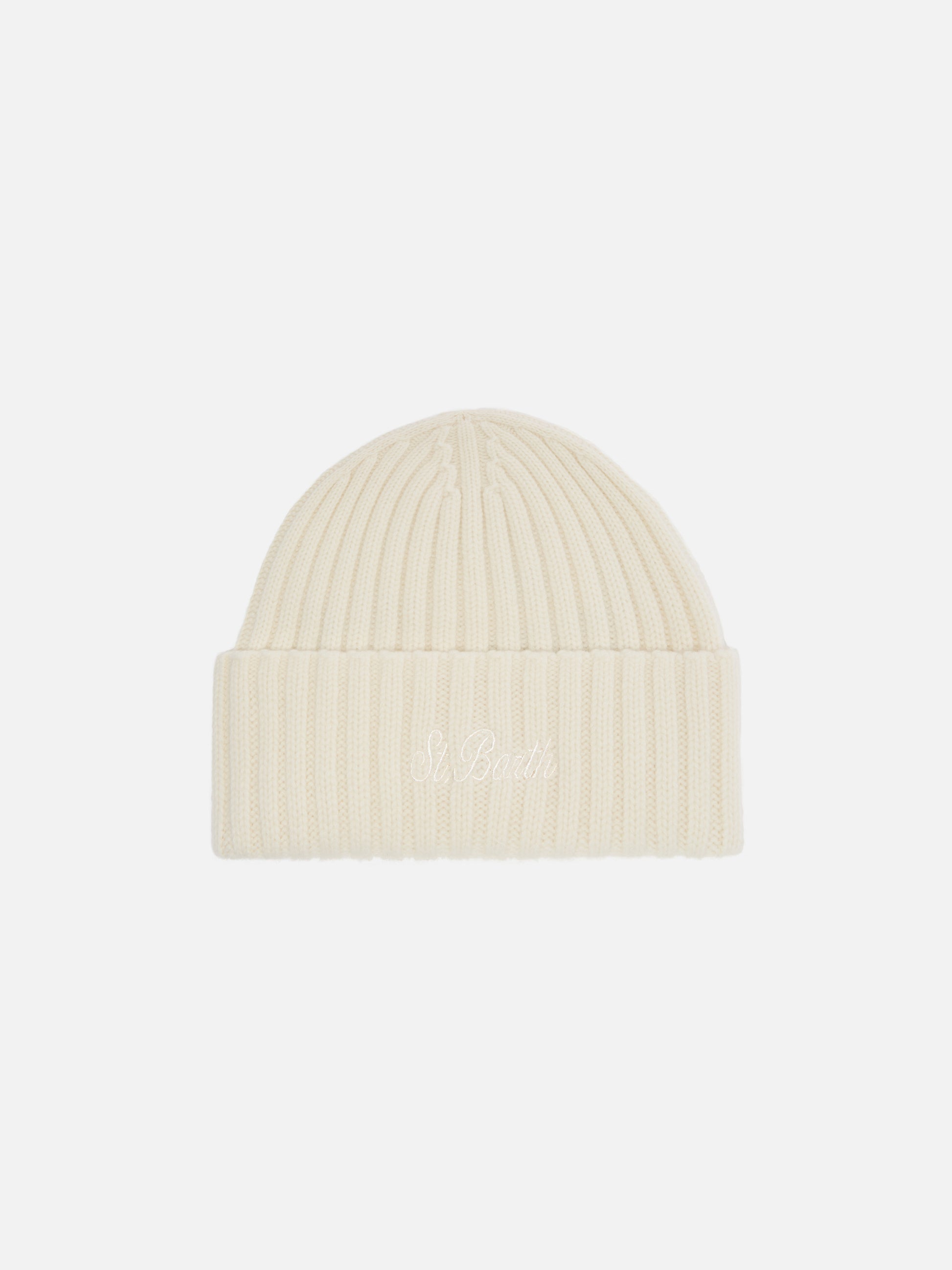 Wengen beanie in wool white with St. Barth embroidery on the turn-up